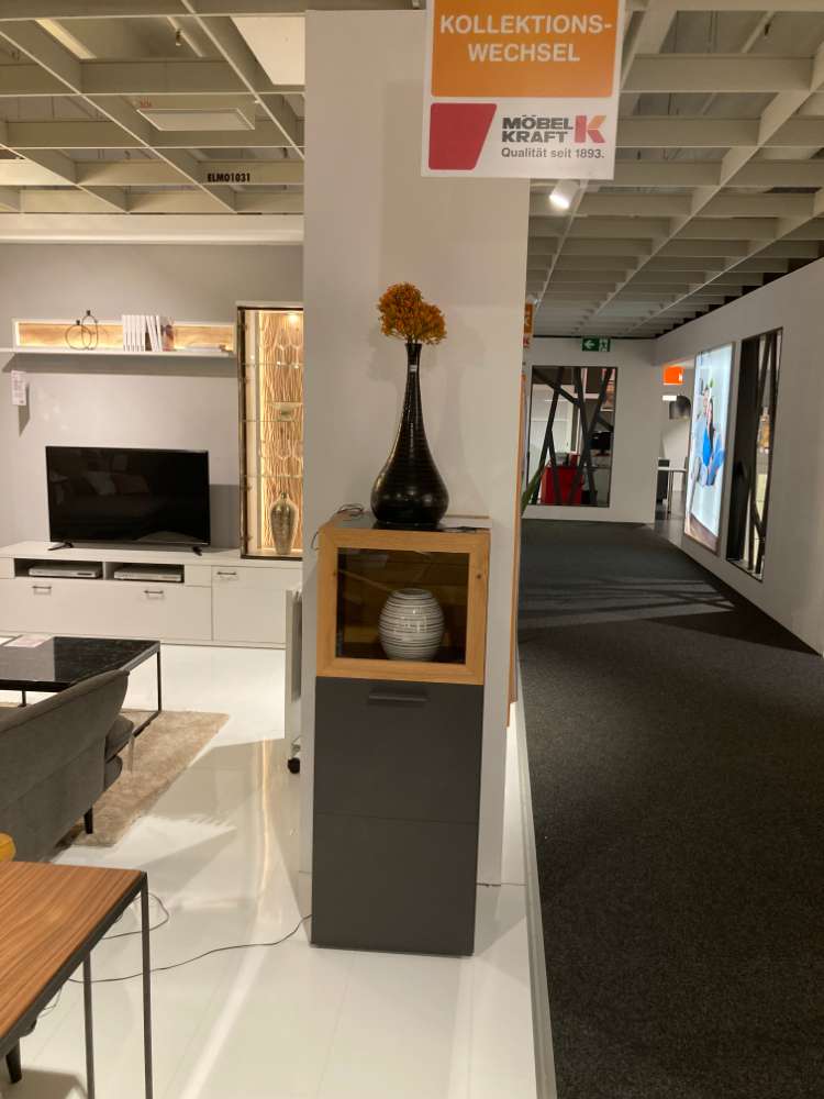 Lack Schiefer grau matt Rahmen und Rückwand: Eiche furniert Oberboden: Parsolglas mit 1 Holz-/Glastür links