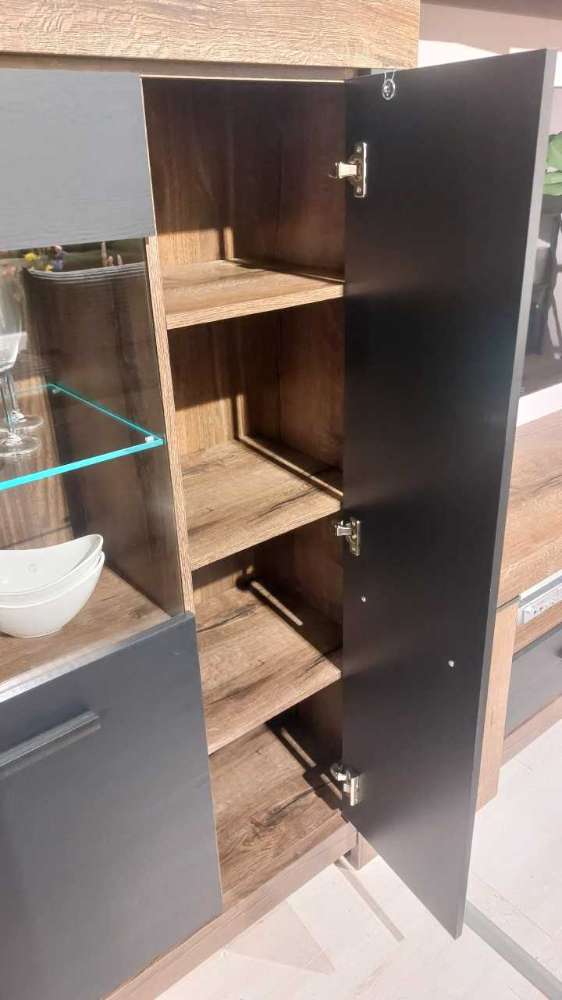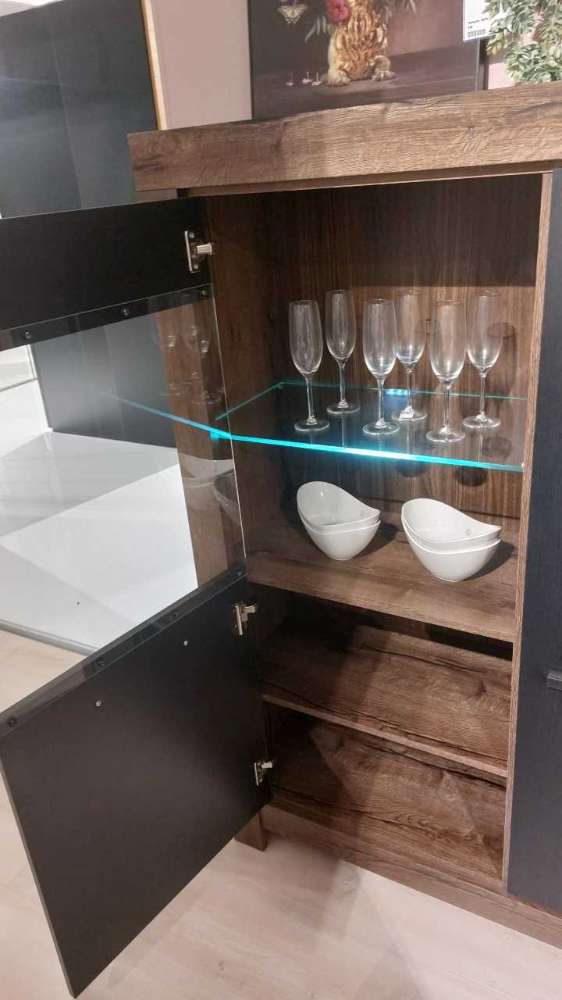 AusführungKorpus Nachbildung Eiche Canyon, Front Nachbildung Schwarzeiche, mit einer Holztür und einer Tür mit Klarglaseinsatz