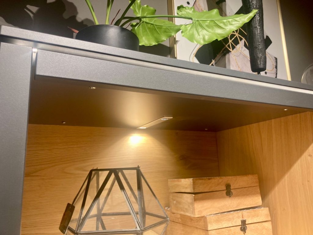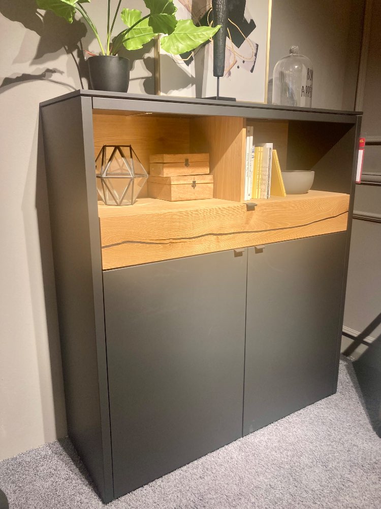 Highboard Game von Venjakob in Lack anthrazit matt, Absetzung: Balkeneiche inklusive Beleuchtung Maße: B/H/T: ca.: 137 x 140 x 43 cm