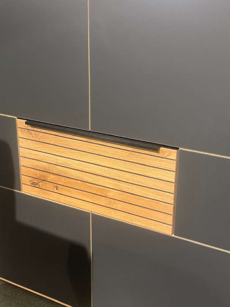 Ein besonderes Highlight ist die integrierte LED-Griffleistenbeleuchtung, die nicht nur funktional ist, sondern auch das edle Holzdesign effektvoll in Szene setzt. Dieses Ausstellungsstück kombiniert den Charme von natürlichem Holz mit moderner Technologie und verwandelt jeden Raum in ein Ambiente der Gemütlichkeit und Klasse. Als Bestandteil der Highboard-Kategorie verbindet es gekonnt Form mit Funktion, was es zu einer idealen Wahl für Liebhaber exklusiver und hochwertiger Möbel macht.