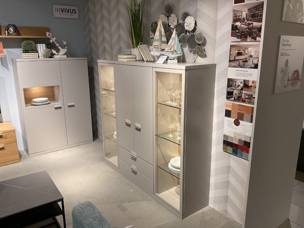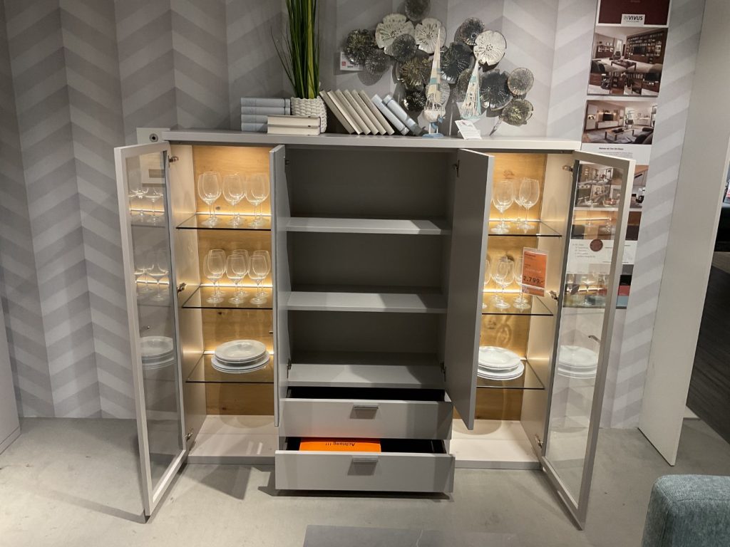Bemerkung Das Highboard Modell "Interno" von RMW vereint Funktionalität und elegantes Design in einem beeindruckenden Möbelstück. Als Ausstellungsstück bietet es nicht nur ästhetische Perfektion, sondern auch hochwertige Ausstattung, die in jedem modernen Wohnzimmer hervorsticht. Die edle Eiche Rückenwand verleiht dem Highboard eine warme, natürliche Ausstrahlung, die perfekt mit der klaren Linienführung harmoniert. Besonderen Glanz erhält das Möbelstück durch die integrierte Beleuchtung: Zwei Strahler mit LED-Spotbeleuchtung setzen spezielle Akzente und sorgen dafür, dass Ihre Lieblingsobjekte im besten Licht erscheinen. Sechs LED-Glaskantenbeleuchtungen schaffen darüber hinaus eine atmosphärische Umgebung, die zum Verweilen einlädt. Alles lässt sich komfortabel über einen Funklichtschalter steuern, wodurch die Bedienung mühelos wird. Mit der Softclose-Funktion schließt das Highboard sanft und geräuschlos. Dieses Möbelstück ist nicht nur stilvoll, sondern auch ein wahres Highlight in puncto Beleuchtung und Komfort.