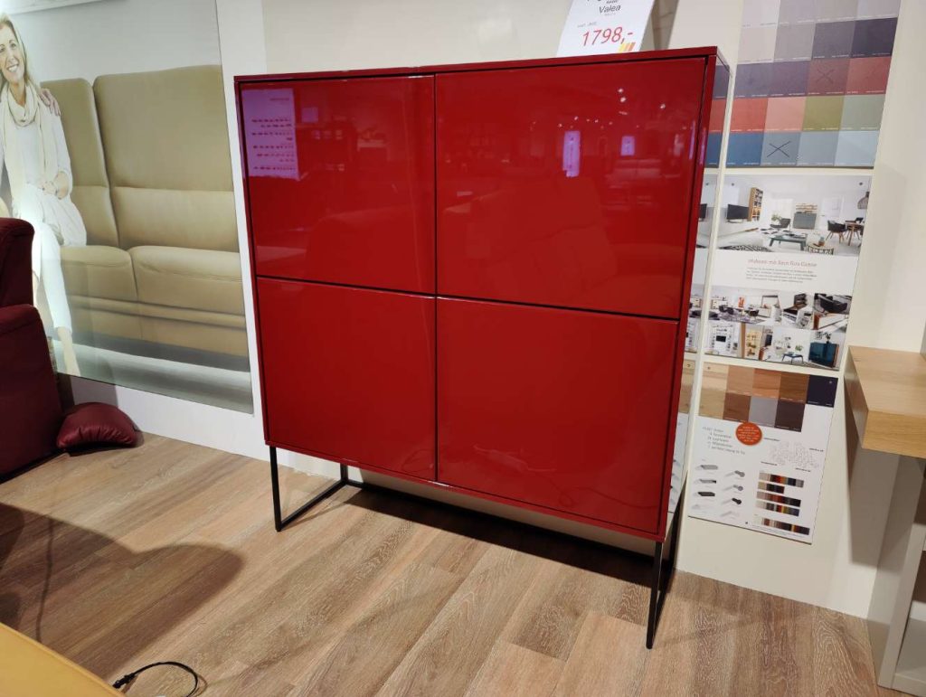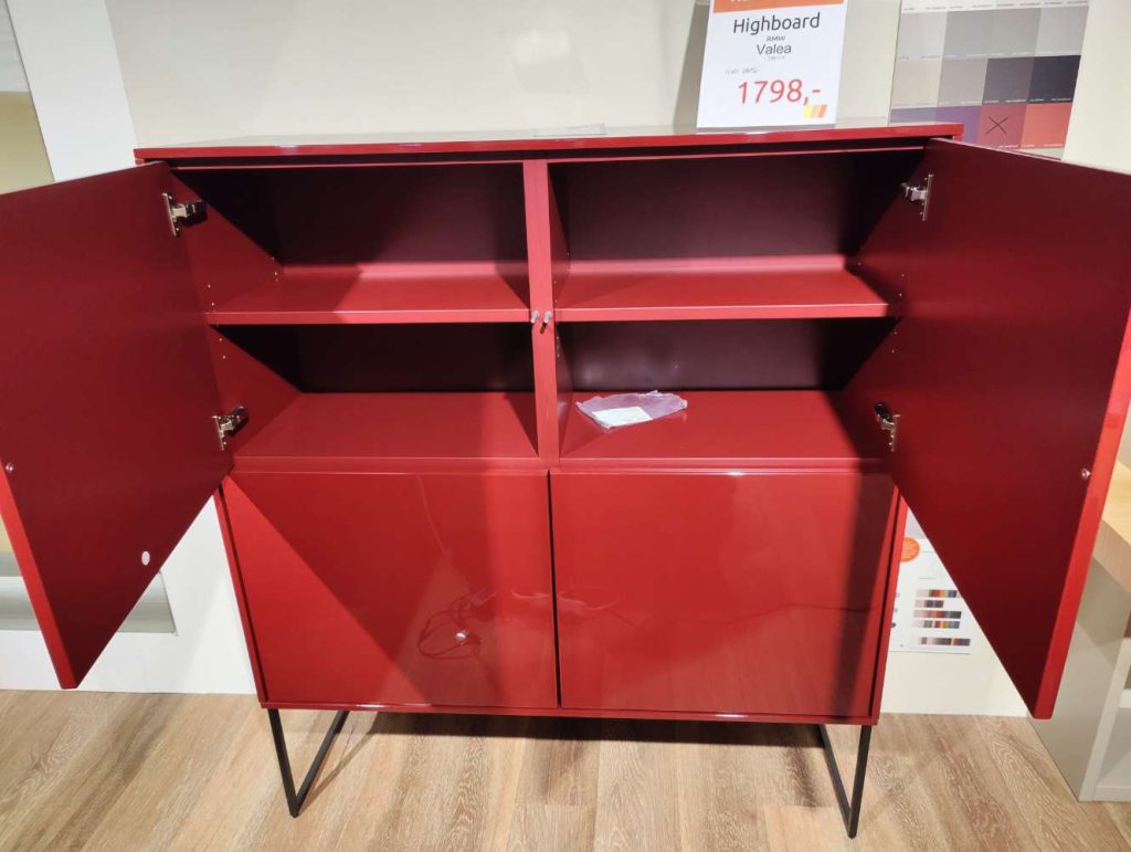 Das Highboard Valea bietet reichlich Stauraum und ist mit einem cleveren Komfort-Tablarauszug ausgestattet. Die Bedienung ist dank der "Push to open"-Funktion besonders komfortabel, wodurch auf störende Griffe verzichtet wird. Die stabile Metallkufe sorgt für sicheren Stand und ergänzt das moderne Gesamtbild. Mit den Maßen von 123,2 x 39,6 x 139,7 cm findet das Highboard in vielen Räumen Platz und bietet viel Stauraum. Made in Germany steht es für Spitzenqualität und durchdachte Funktionalität. Als Ausstellungsware ist es ein einzigartiger Blickfang in Ihrem Wohnraum.