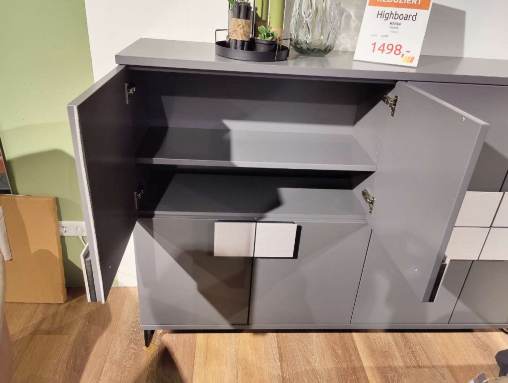 BemerkungDas Vienna Highboard von RMW in edlem Schiefergrau ist ein Highlight für jedes moderne Wohnambiente. Mit seiner imposanten Größe von 180 x 135 x 40 cm bietet dieses Qualitätsmöbelstück nicht nur reichlich Stauraum, sondern auch eine beeindruckende Optik. Die acht Türen des Highboards sind in einem feinen Lack gehalten, was für eine elegante und leicht zu reinigende Oberfläche sorgt. Die Rückwand in Feinschliff Bianco fügt einen subtilen Kontrast hinzu und akzentuiert das stilvolle Design.