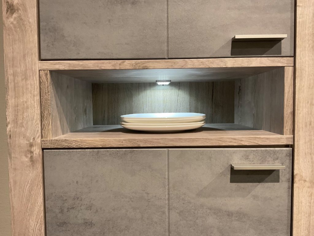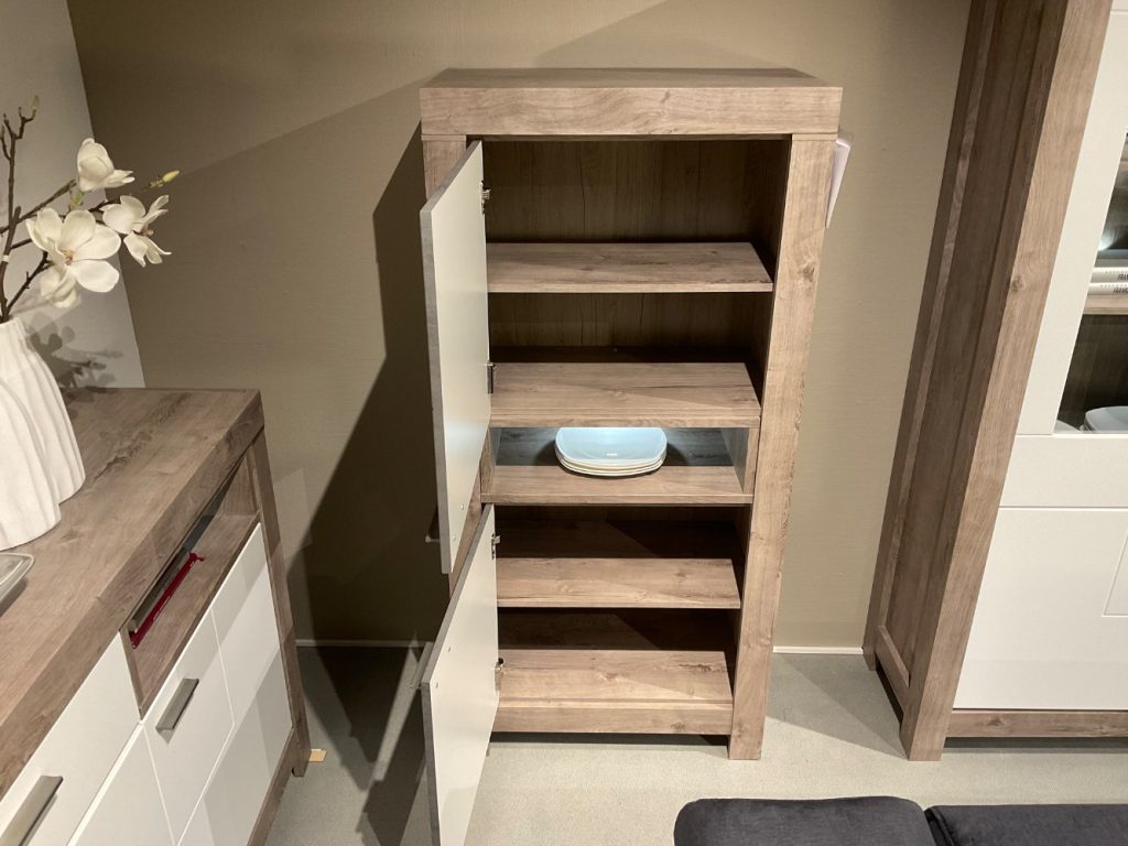 BemerkungDas Highboard Granada präsentiert sich als ein stilvoller Blickfang in jedem Raum und vereint Funktionalität mit einem modernen Design. Dieses Ausstellungsstück beeindruckt durch seine elegante Haveleiche-Nachbildung, die dem Korpus sowie den Absetzungen eine warme und natürliche Ausstrahlung verleiht. Mit seinen kompakten Maßen von ca. 76 cm in der Breite, 160 cm in der Höhe und 42 cm in der Tiefe passt es perfekt in unterschiedliche Wohnkonzepte, ohne den Raum zu dominieren.