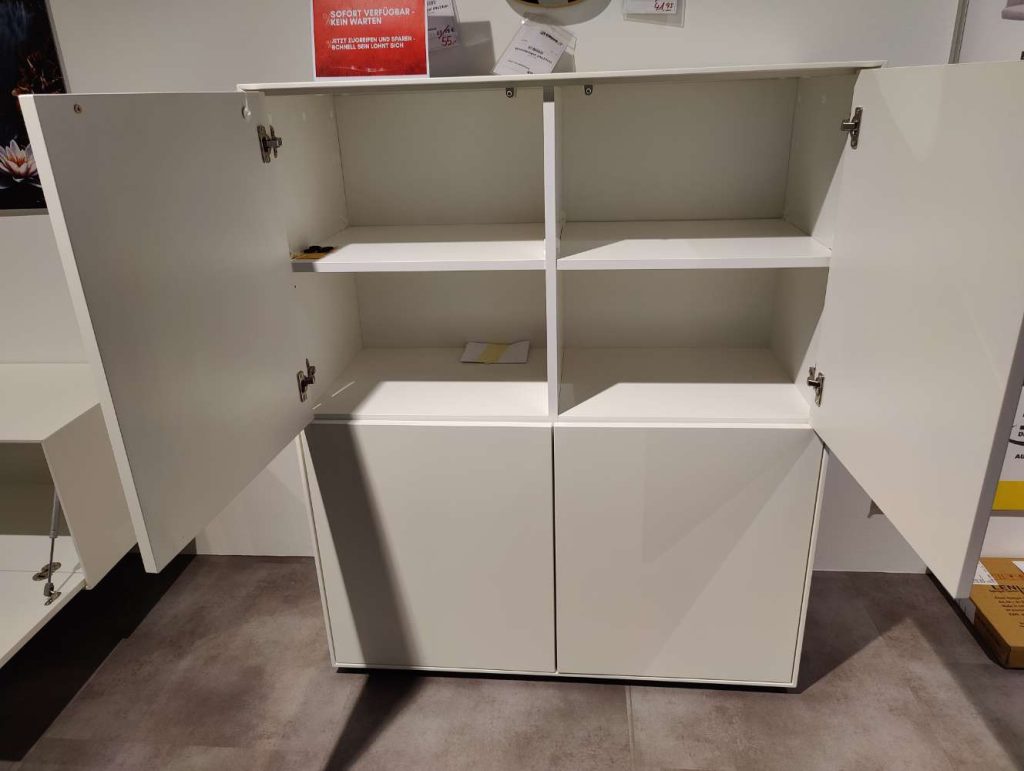 Die vier Türen des Highboards sind grifflos gestaltet und lassen sich durch die "Push to open"-Funktion mühelos öffnen und schließen, was die klare Linienführung des Möbels unterstreicht. Mit einer Höhe von 100 cm, einer Breite von 120 cm und einer Tiefe von 43 cm bietet dieses Möbelstück reichlich Stauraum, während es auf stabilen Gleitern standfest in Ihrem Raum platziert werden kann. Das Moiano Highboard von Trendhopper ist die ideale Wahl für alle, die minimalistischen Stil mit praktischer Anwendung kombinieren möchten.