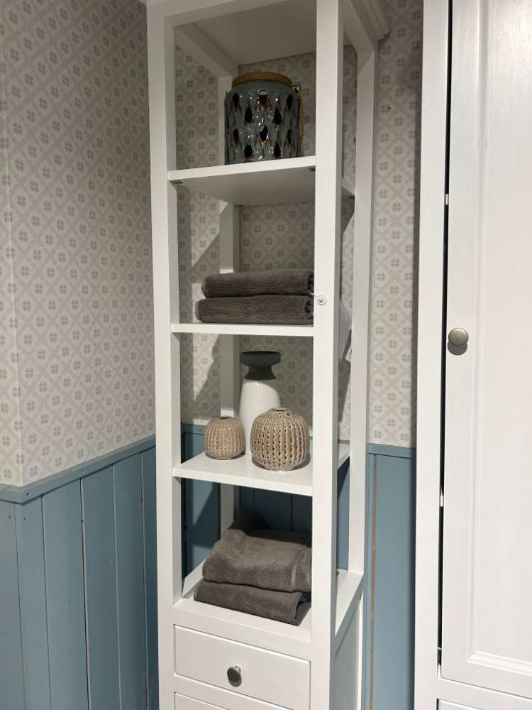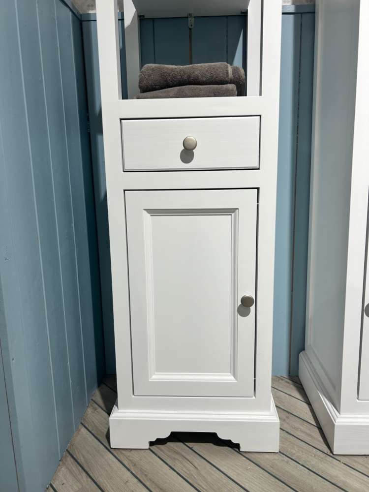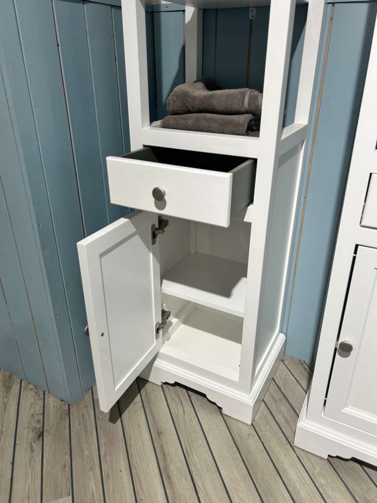 Front: Kiefer Massiv Weiß Korpus: Kiefer Massiv Weiß 4 offene Fächer, 1 Schubkasten und 1 Tür *inkl. Griffe
