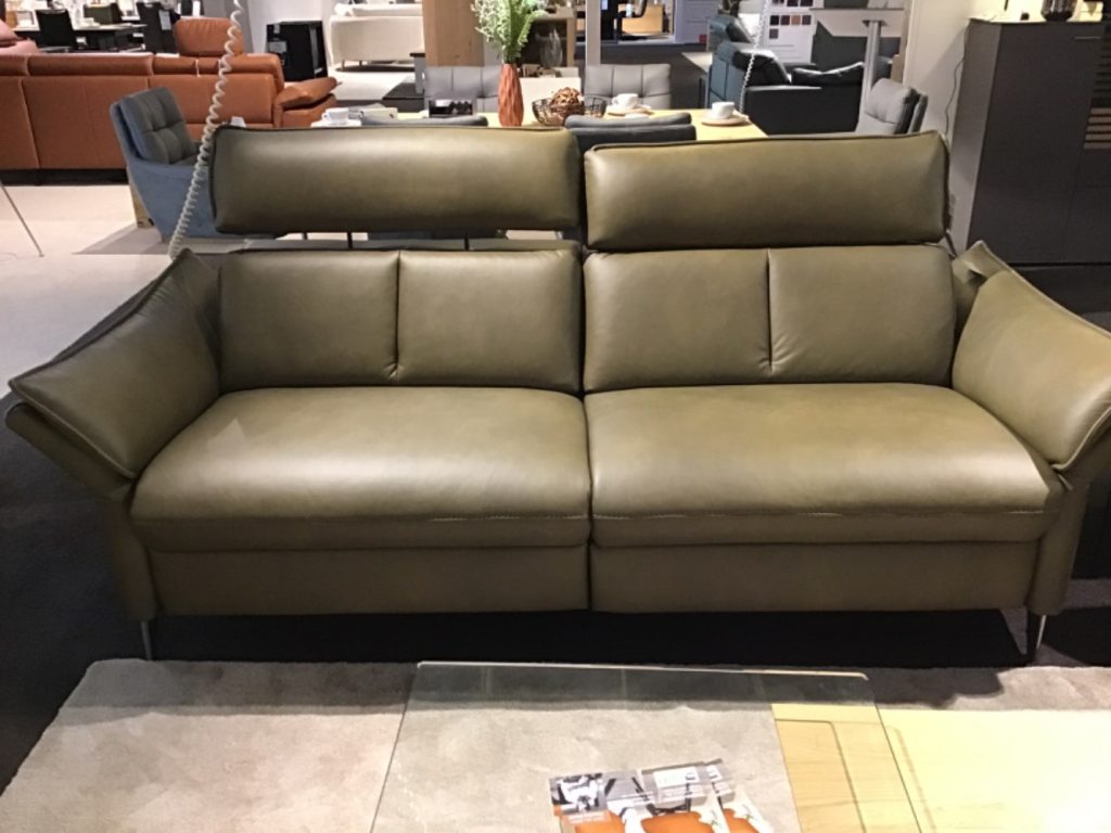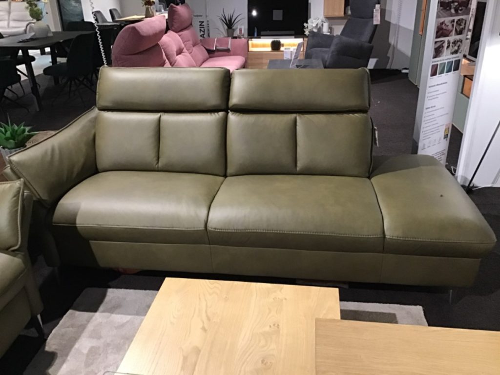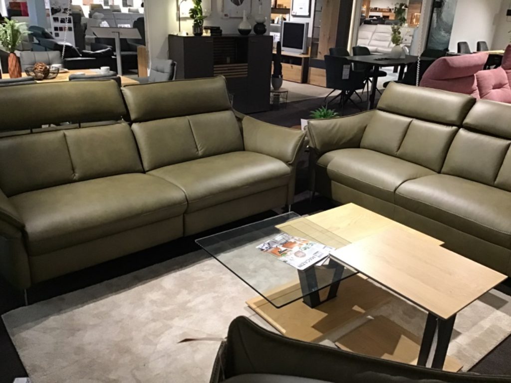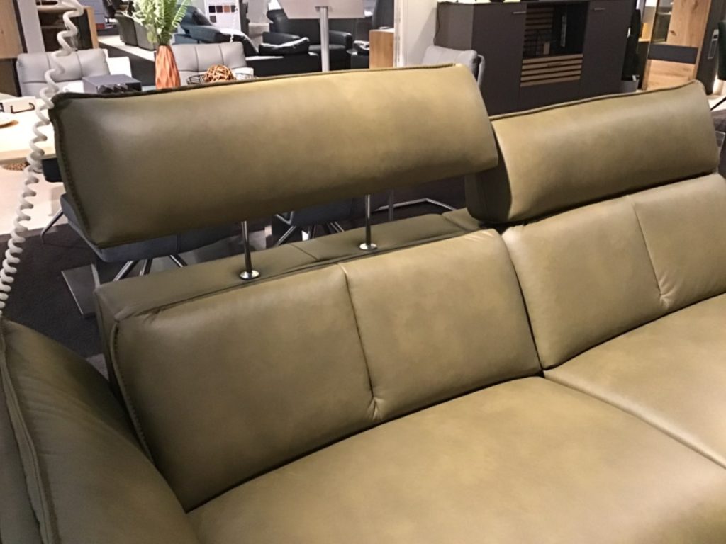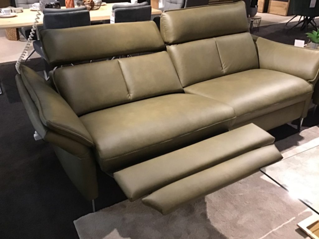 Moderne Ledergarnitur in der Farbe moos. Die motorische Relaxfunktion lädt zum entspannen ein..