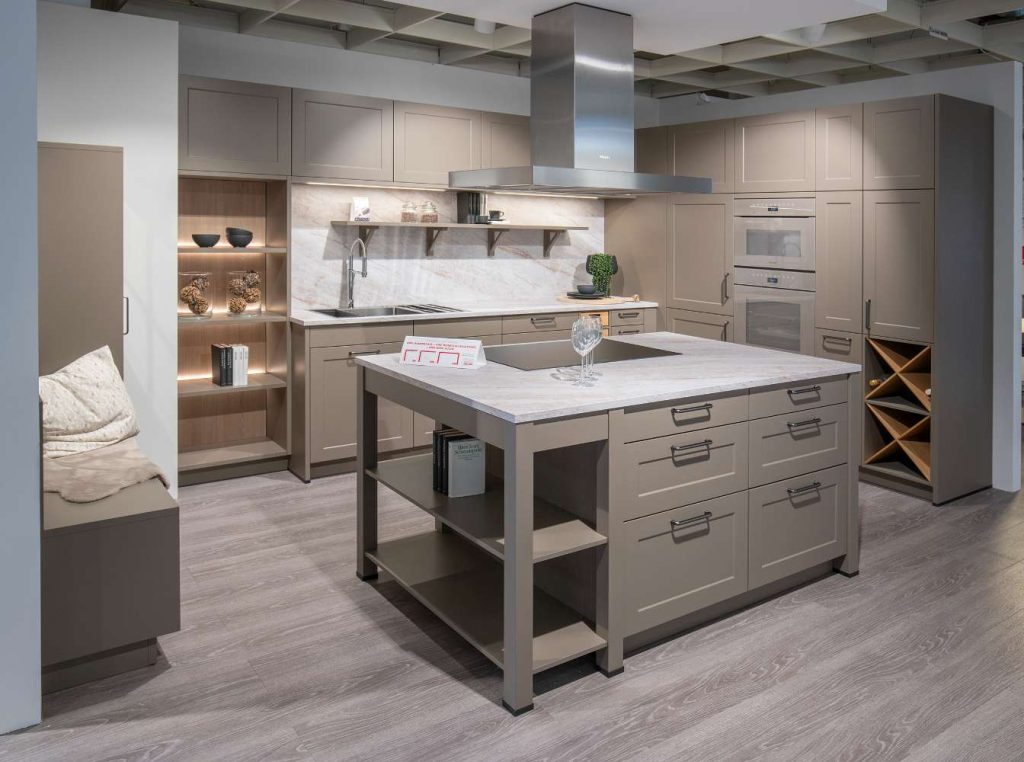 Die Küche ist ausgestattet mit modernsten Miele Elektrogeräten, die für zuverlässige Leistung und Langlebigkeit stehen. Diese Elektrogeräte integrieren sich nahtlos in das stilvolle Design und bieten Ihnen die neueste Technologie, um jede kulinarische Herausforderung zu meistern. Die elegante Kombination aus traditionellem Landhausstil und innovativer Technik schafft eine harmonische Atmosphäre, die sowohl im Alltag als auch bei besonderen Gelegenheiten einlädt, in der Küche zu verweilen und zu genießen. Diese Ausstellungsküche von INTERLINE verkörpert den Inbegriff von Qualität und klassischem Design für Ihr Zuhause.