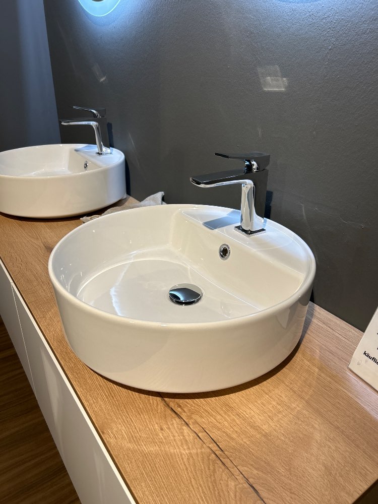 Trendiges Design in griffloser Lacklaminatfront in Alpinweiss. Moderne runde Spiegel mit umliegender Beleuchtung.