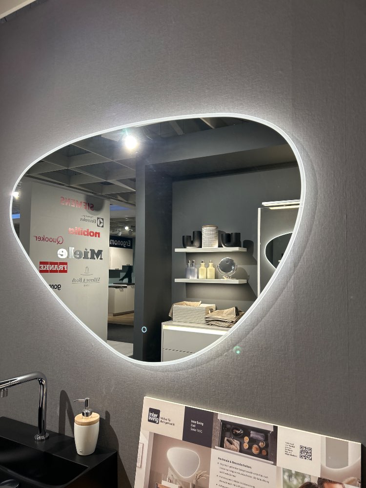 Organische Spiegelform mit umlaufender LED Beleuchtung. Push-To-Open Funktion im Unterschrank.Aufsatzbecken in schwarz.