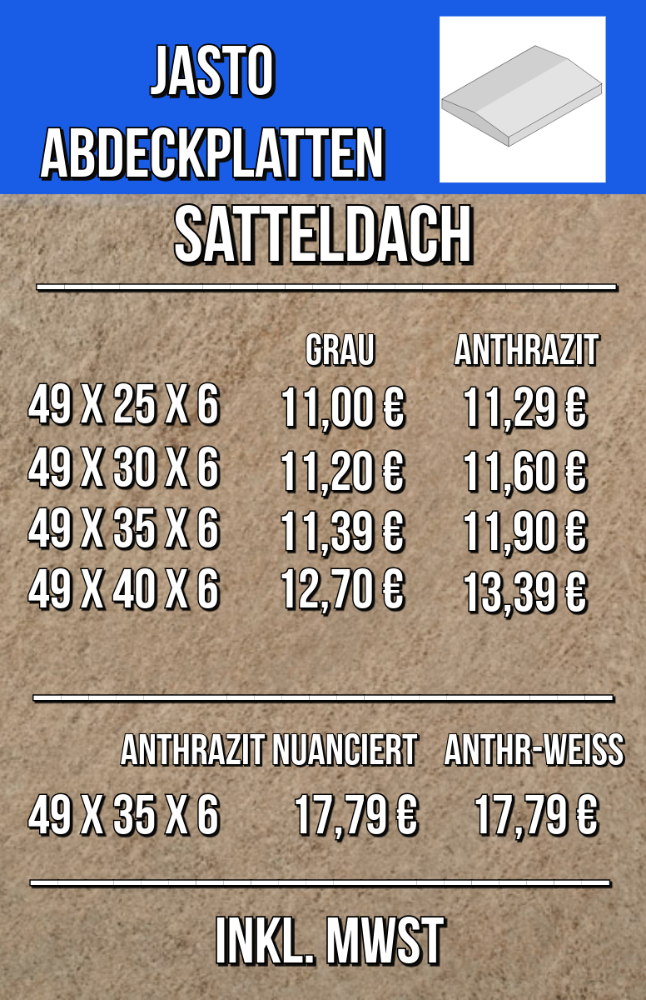 Bemerkung Alternativ direkt beim Hersteller abholbar. Verschiedene Farben und Tiefen verfügbar. Auch als Flachdach erhältlich. https://jasto.de/gartenwelt/mauersysteme/mauer-und-pfeilerabdeckungen/