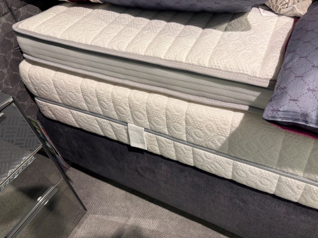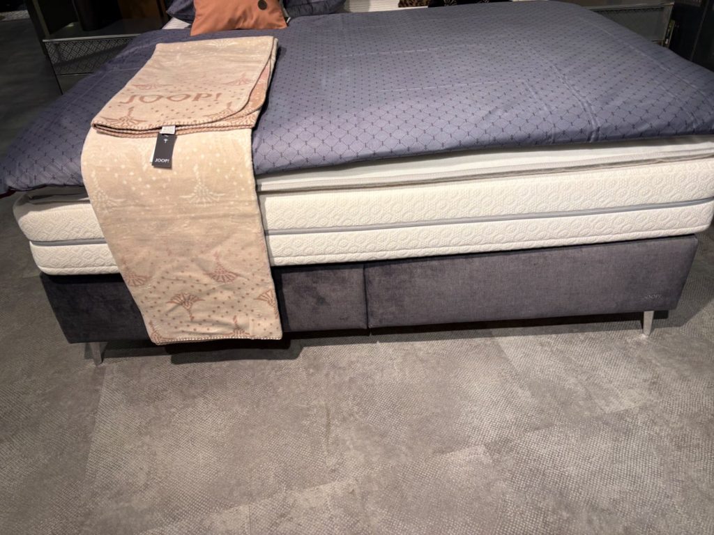 BemerkungDas Boxspringbett Modell "Bags" von JOOP, hergestellt in Kreuzlingen, vereint zeitloses Design mit exzellenter Handwerkskunst. Dabei besticht es durch seine elegante, gemusterte Oberfläche, die mit dem charakteristischen Joop! Cornflower verziert ist. Diese subtile Musterung verleiht jedem Schlafzimmer eine raffinierte Note und lässt das Bett zu einem stilvollen Mittelpunkt werden. Es handelt sich um eine Ausstellungsware, die den gewohnt hohen Qualitätsstandard von JOOP unterstreicht. Das großzügige Maß von ca. 204 cm Breite, 120 cm Höhe und 218 cm Tiefe sorgt für erholsamen Schlafkomfort und ausreichend Platz für entspannte Nächte. Das verwendete Stoffmaterial ist hochwertig und gleichzeitig pflegeleicht, um langfristig Freude an diesem exzellenten Möbelstück zu gewährleisten. Egal, ob Sie ein modernes oder klassisches Ambiente bevorzugen, das Boxspringbett "Bags" harmoniert durch sein durchdachtes Design ideal mit verschiedensten Einrichtungsstilen.