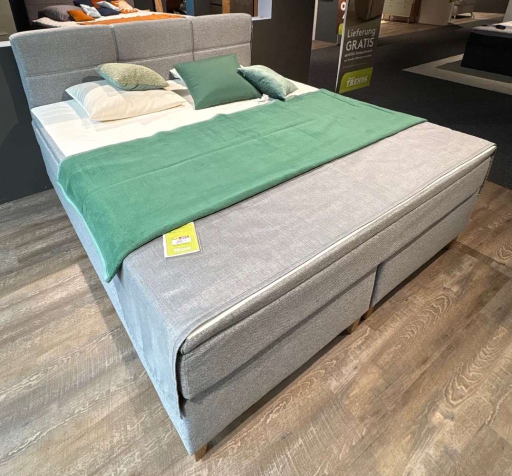 BemerkungDas Boxspringbett Kenora von Sun Garden vereint Stil und Komfort in einem ansprechenden Design. Als Austellungsware präsentiert es sich mit einer hochwertigen Verarbeitung, die direkt ins Auge fällt. Das Bett besticht durch seine zwei Boxspring-Basisgestelle, die zusammen mit den stabilen Kunststofffüßen eine solide Grundlage bieten. Die Füße in elegantem Eichen-Look, mit einer Höhe von ca. 14 cm, verleihen dem Bett eine natürliche und moderne Anmutung.