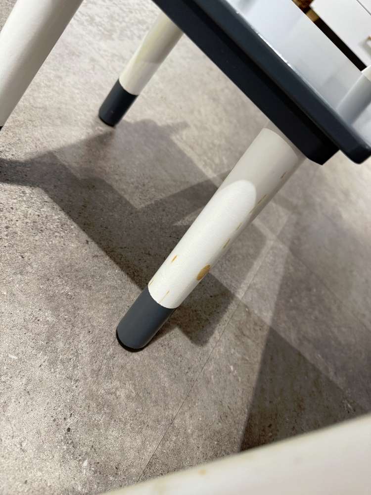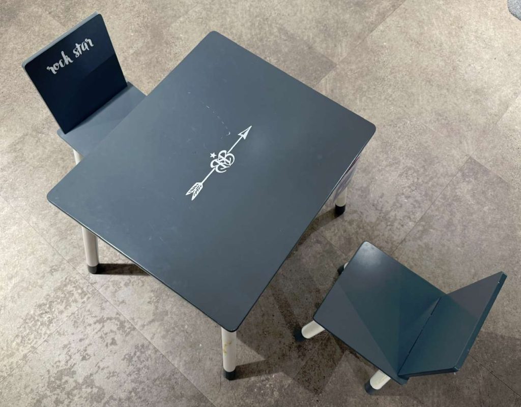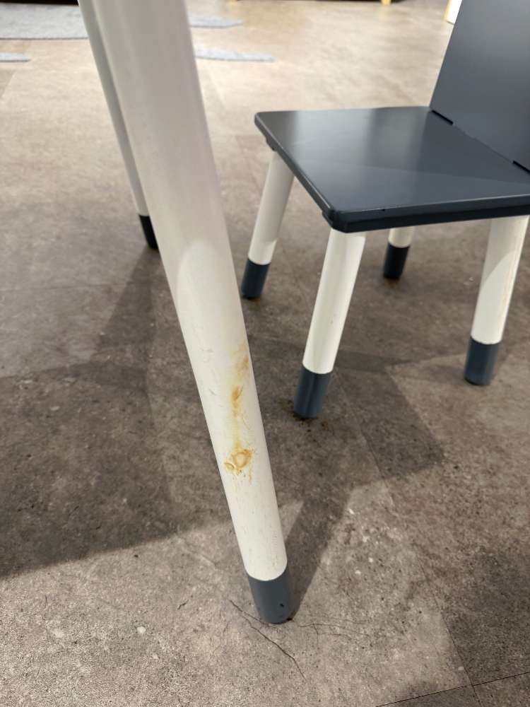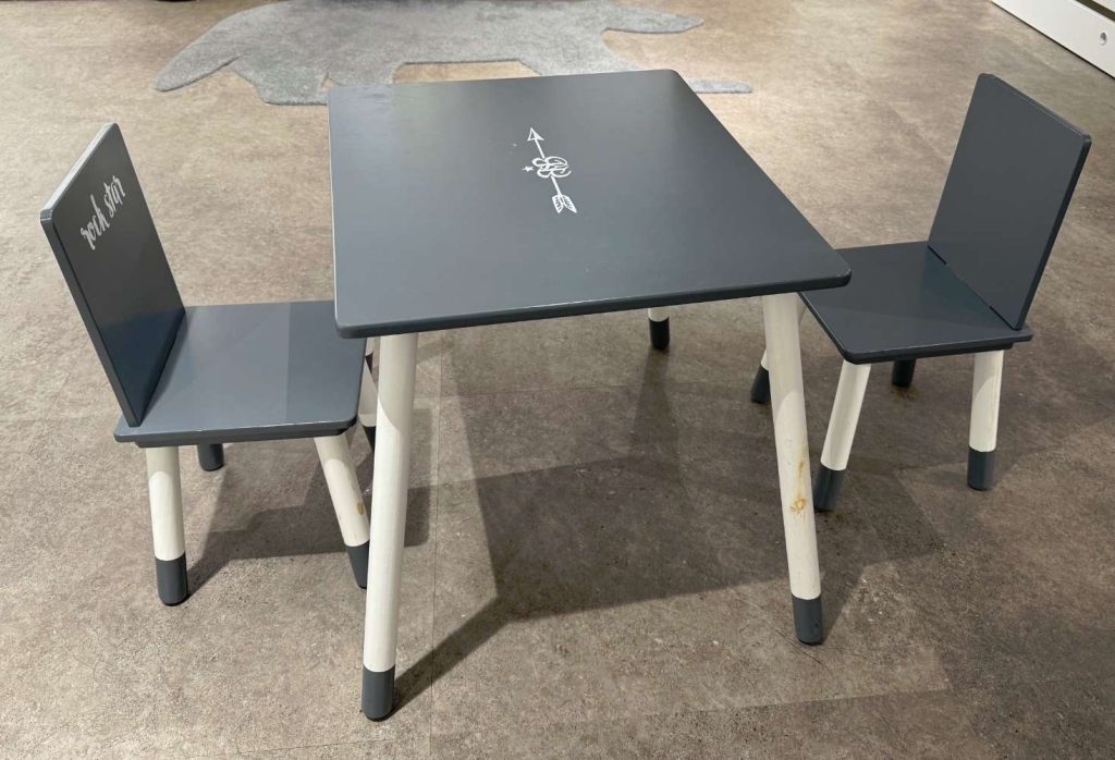 - 1 Tisch und 2 Stühle - aus lackiertem MDF - mit Gebrauchsspuren (siehe Fotos)