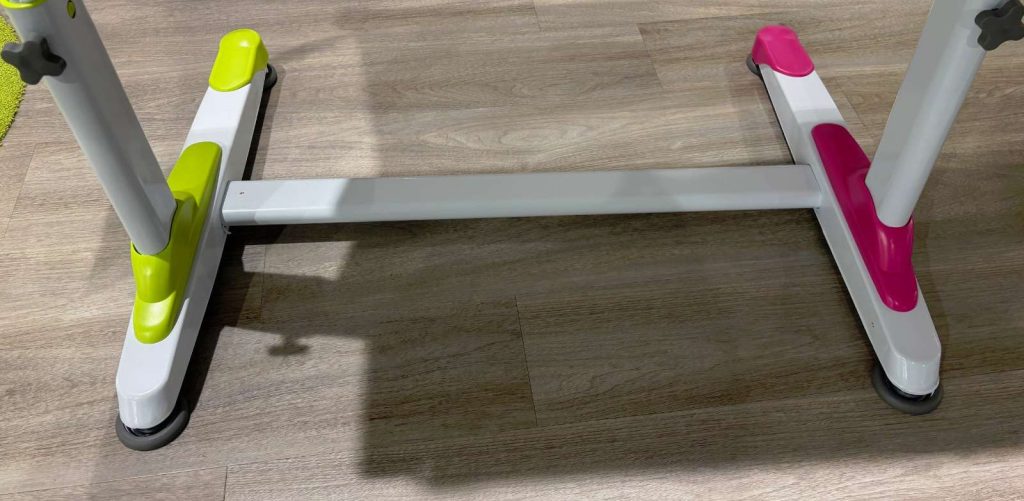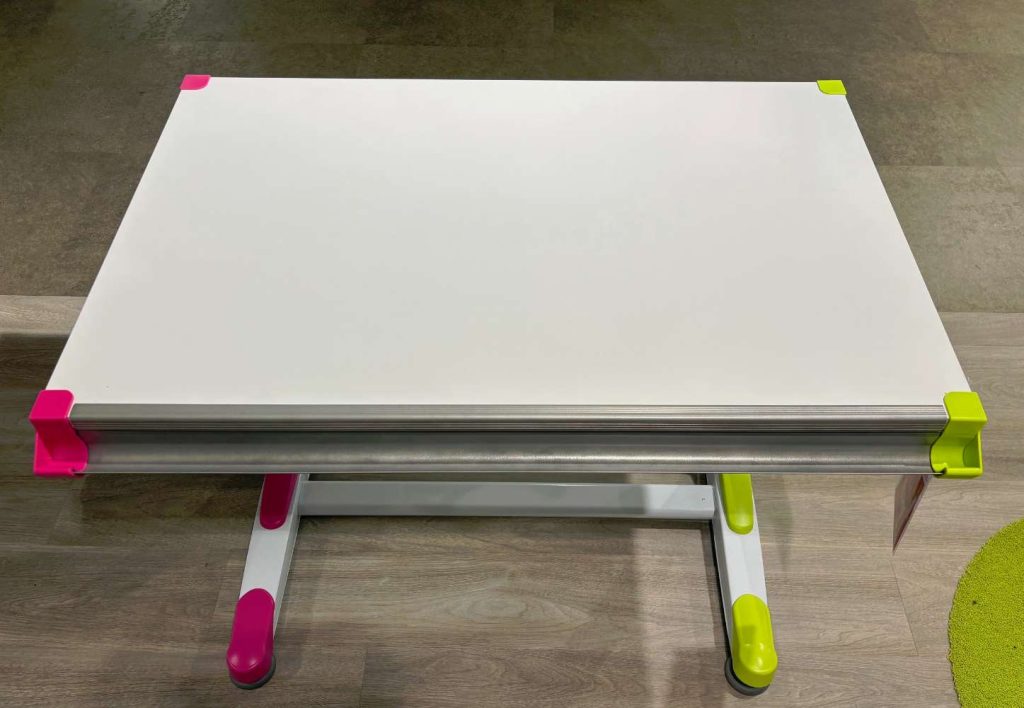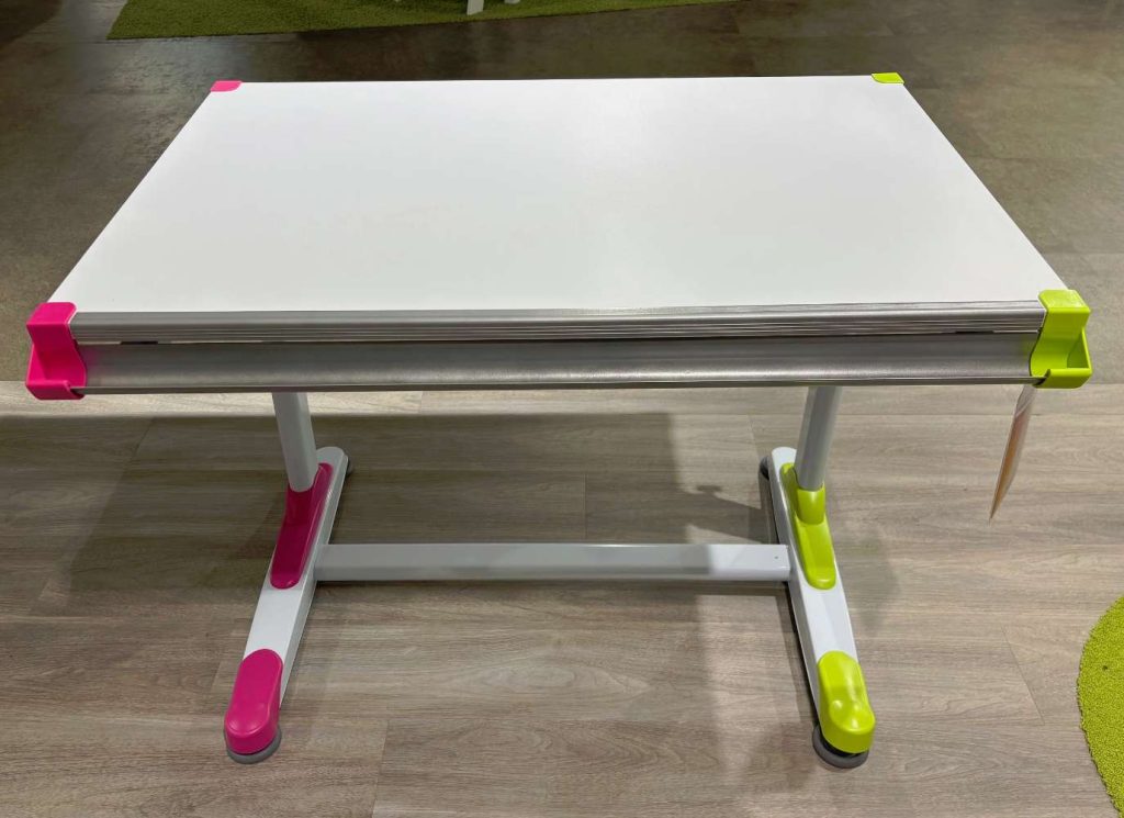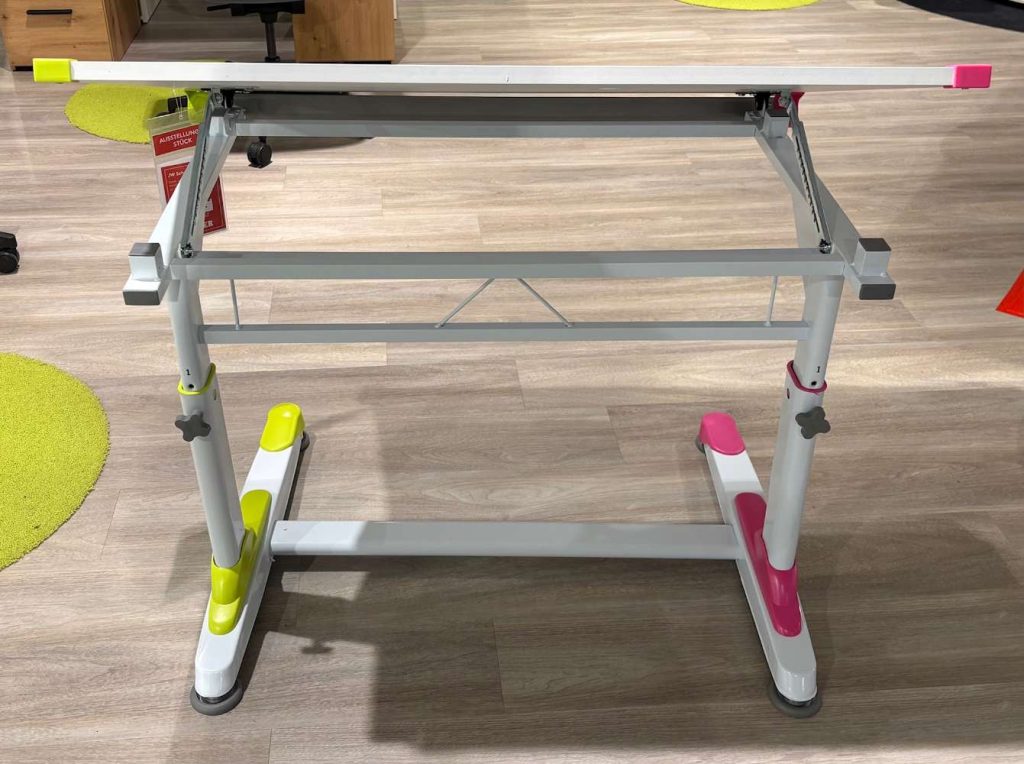 Ein herausragendes Merkmal dieses Modells ist die Tischplatte, die sich sowohl in der Höhe verstellen als auch neigen lässt, um eine optimale Anpassung an verschiedene Arbeitspositionen zu ermöglichen. Die Platte präsentiert sich in einem frischen Weiß, kombiniert mit austauschbaren Farbapplikationen in Pink und Grün, die eine spielerische Note hinzufügen und den individuellen Stil unterstreichen. Das stabile Metallgestell in Grau verleiht dem Schreibtisch eine moderne und zugleich solide Ausstrahlung.
