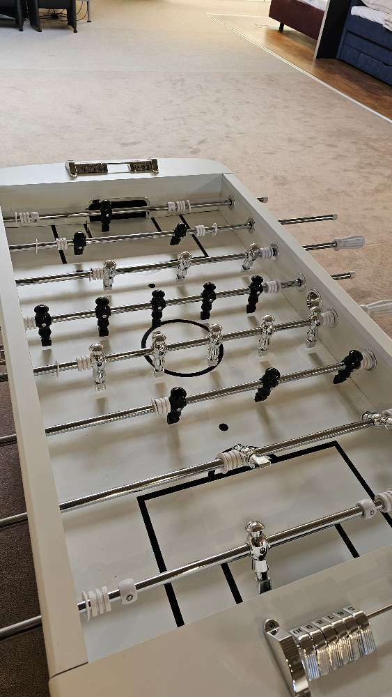 Bemerkung Der Tischkicker Style 75185 von KARE bringt Spielspaß und Design in Einklang. Mit seiner eleganten Farbkombination aus Weiß, Schwarz und Chrom ist er nicht nur ein Spielgerät, sondern auch ein stilvoller Blickfang in jedem Raum. Die robuste Konstruktion aus verchromtem Stahl und die kunststoffbeschichtete Spielfeldoberfläche aus Spanplatte sorgen für Langlebigkeit und dynamisches Spielerlebnis. Die verchromten Edelstahlstangen bieten hervorragende Kontrolle und Präzision, während die Spieler in klassischem Schwarz designtechnisch bestens zur Geltung kommen. Das Gestell besteht aus einer mitteldichten Faserplatte, die ebenfalls kunststoffbeschichtet ist, was für eine stabile Standfestigkeit sorgt. Mit den Maßen von ca. 125 x 90 x 145 cm bietet der Tischkicker ausreichend Platz für spannende Matches. Als praktisches Extra werden vier Spielbälle mitgeliefert. Die hochwertige Ausstellungsware ist ideal für alle, die Wert auf Design und Spielvergnügen legen.