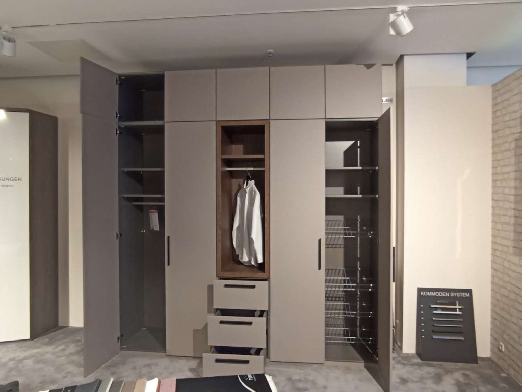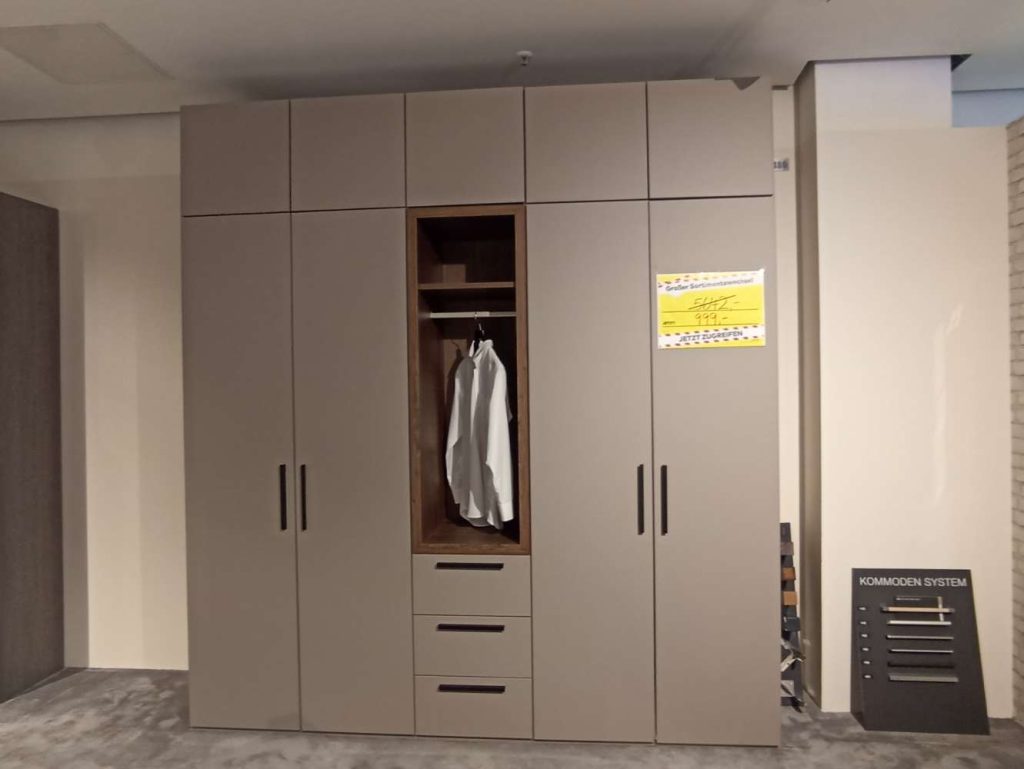Kleiderschrank Y1 Terra - matt Innen: X1 Leinenoptik Twist bestehend aus: 1x Drehtüren-Startelement 2-türig 1x Drehtüren-Aufsatzschrank 1x Funktionselement mit Garderobe und 3 Schubkästen 1x Drehtüren-Aufsatzschrank 1x Drehtüren-Anbauelement 2-türig 1x Rechte Abschlusssteite
