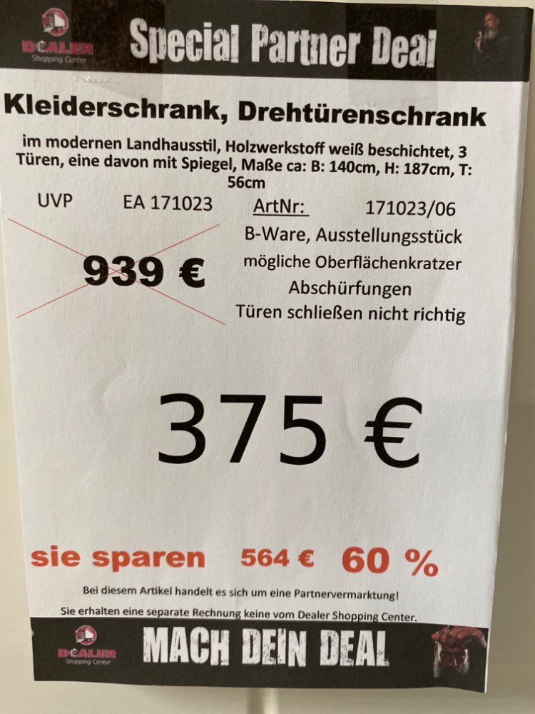 Bemerkung Mach deinen Deal! Hierbei handelt es sich um ein Angebot vom Dealer Shopping Center! Standort des Artikels ist Zeitz Kretzschau. Details wie technische Daten oder Schäden entnehmen Sie dem Bild mit Preis. BEZAHLUNG:  Bargeld, EC-Kartenzahlung, Kreditkarte oder 0% Finanzierung mit Consors Bank. RESERVIERUNG: Bei einem längeren Anfahrtsweg und vorheriger Absprache mit dem Verkäufer vor Ort ist eine Reservierung, für die Dauer der Fahrt -maximal  jedoch für 4 Stunden- möglich. Von Sonderanfragen bitten wir abzusehen. WICHTIG Bitte telefonisch erfragen ob der Wunschartikel noch verfügbar ist. Zwischenverkauf vorbehalten. Die Besichtigung, der Verkauf und die Abholung erfolgt ausschließlich bei unserem Handelspartner. Dealer Shopping Center , 06712 Kretzschau Zeitz Grana, Leipziger Straße 18, Ihren Ansprechpartner erreichen Sie telefonisch unter 015906377060 Öffnungszeiten : MO-FR 9:00-18:00 Uhr, SA 9:00 – 14:00 Uhr. Alle Inserate sind unverbindlich. Preisirrtümer und Änderungen vorbehalten. Abbildung ähnlich. Mehrere Rabattaktionen sind nicht kombinierbar. Weitere sichtbare Artikel können bei Verfügbarkeit zusätzlich erworben werden!