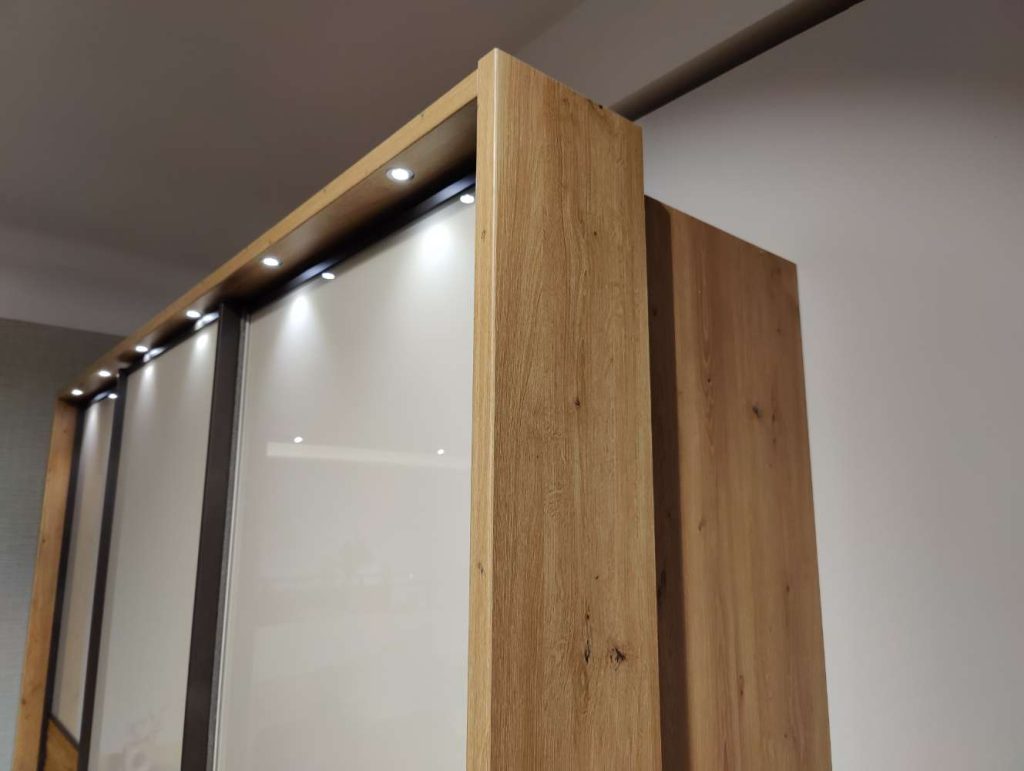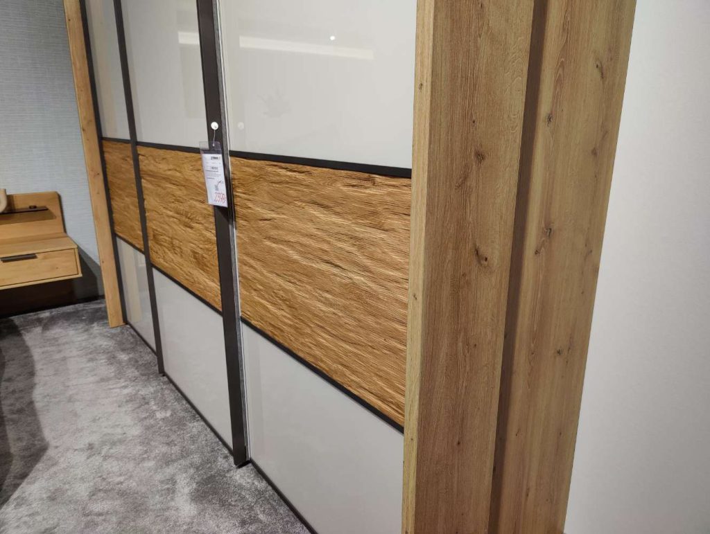 OberflächeSchwebetüren aus Glas & Riffholz massiv