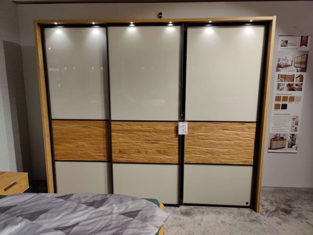 Mit Maßen von 260 x 221 x 69 cm bietet das Modell großzügigen Platz für Kleidung und andere Utensilien. Ein besonderes Extra ist das inkludierte Passepartout mit integrierter Beleuchtung, welches den Schrank stilvoll in Szene setzt und den Raum erhellt. Als Ausstellungsware bietet dieses Möbelstück die Möglichkeit, sich von seiner Qualität und Ästhetik direkt zu überzeugen. Insgesamt vereint der IL 1027 Funktionalität mit modernem Design und hochwertiger Verarbeitung, was ihn zu einem idealen Herzstück für jedes Schlafzimmer macht.