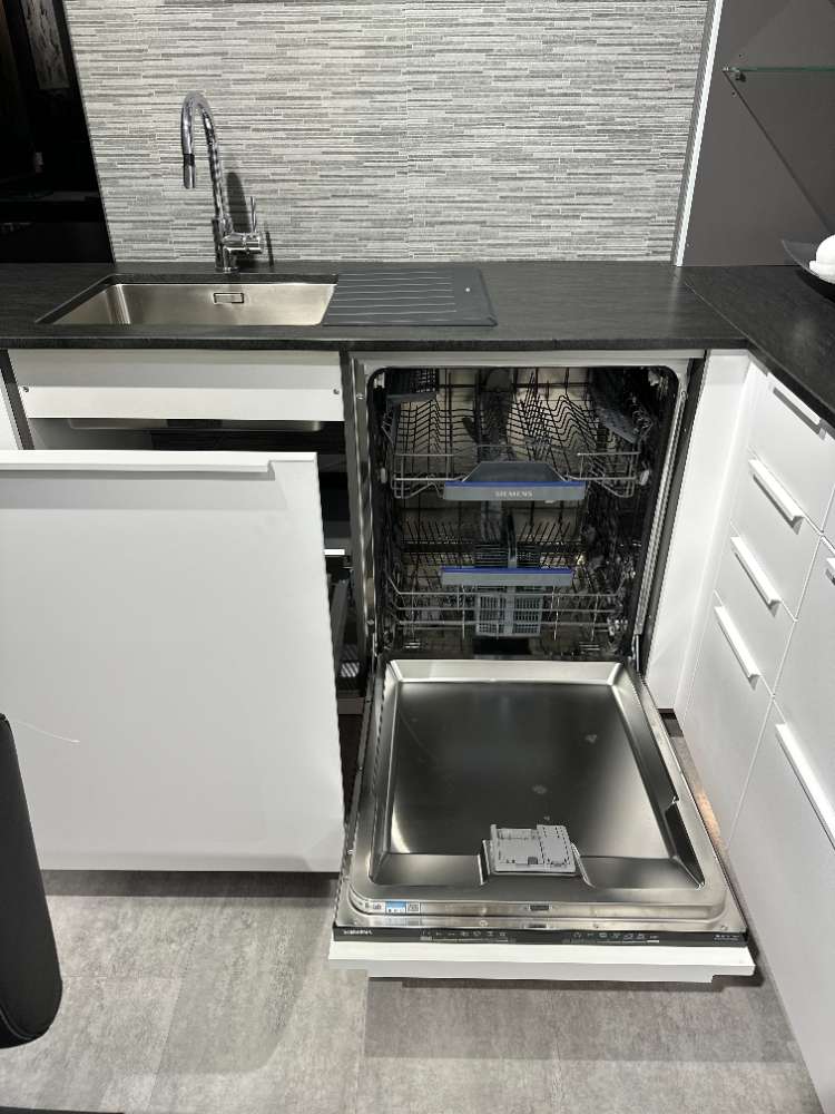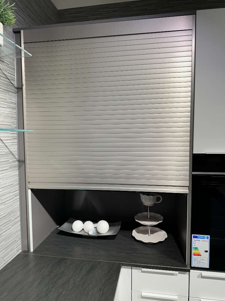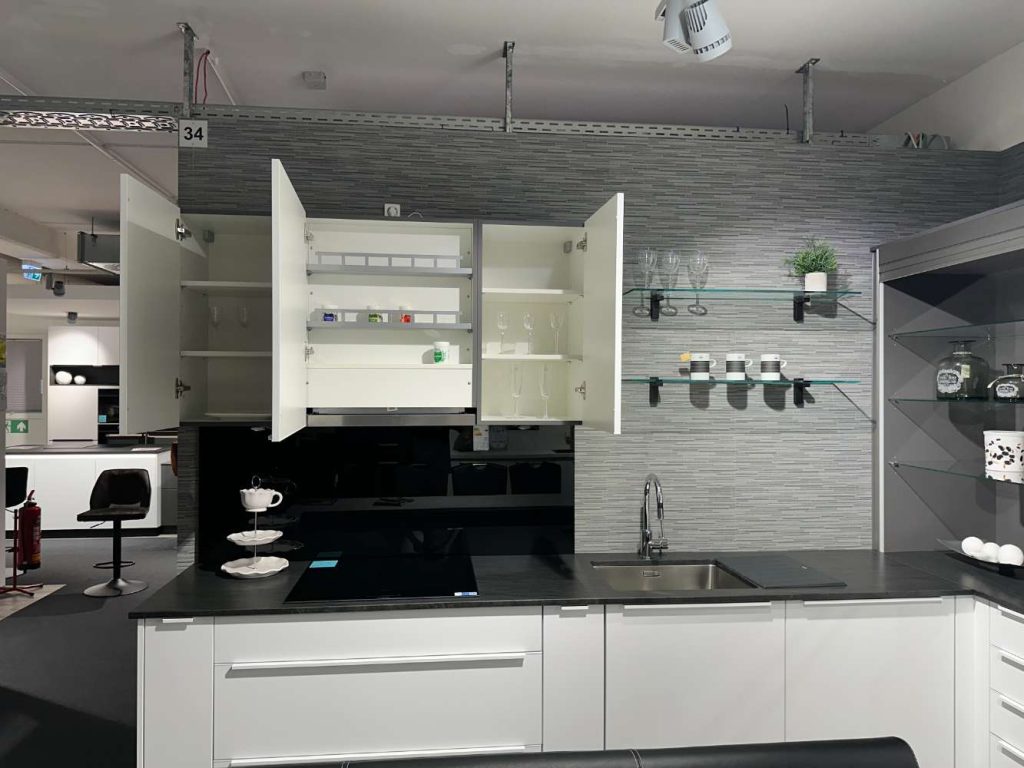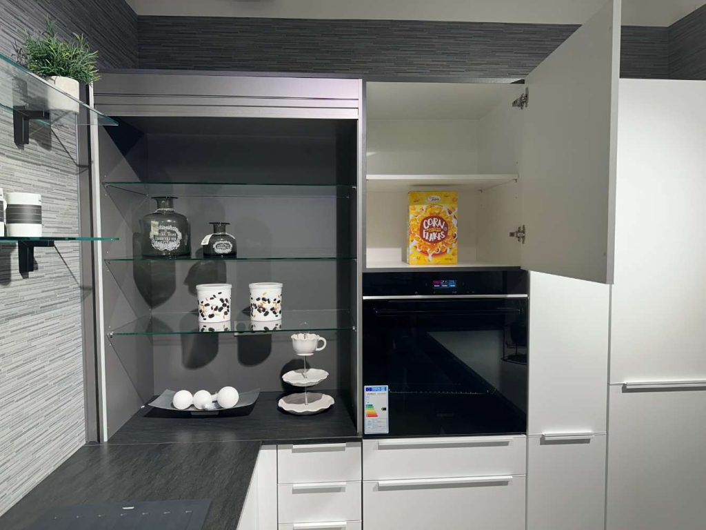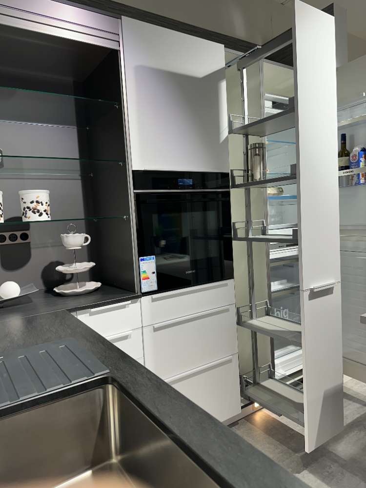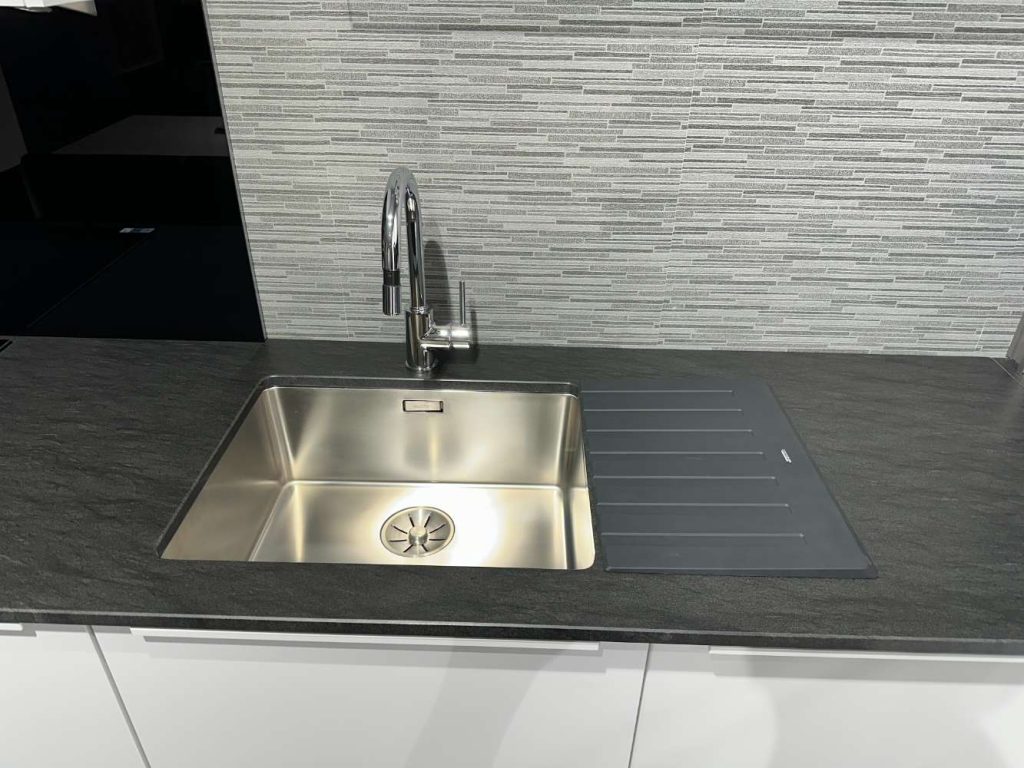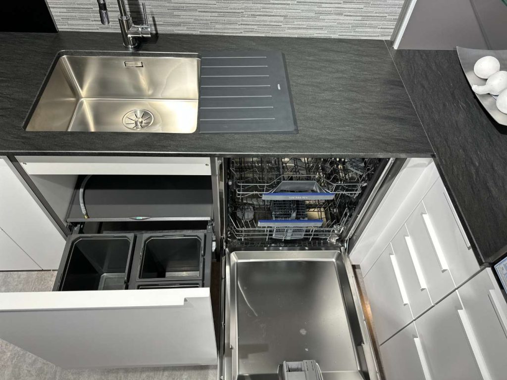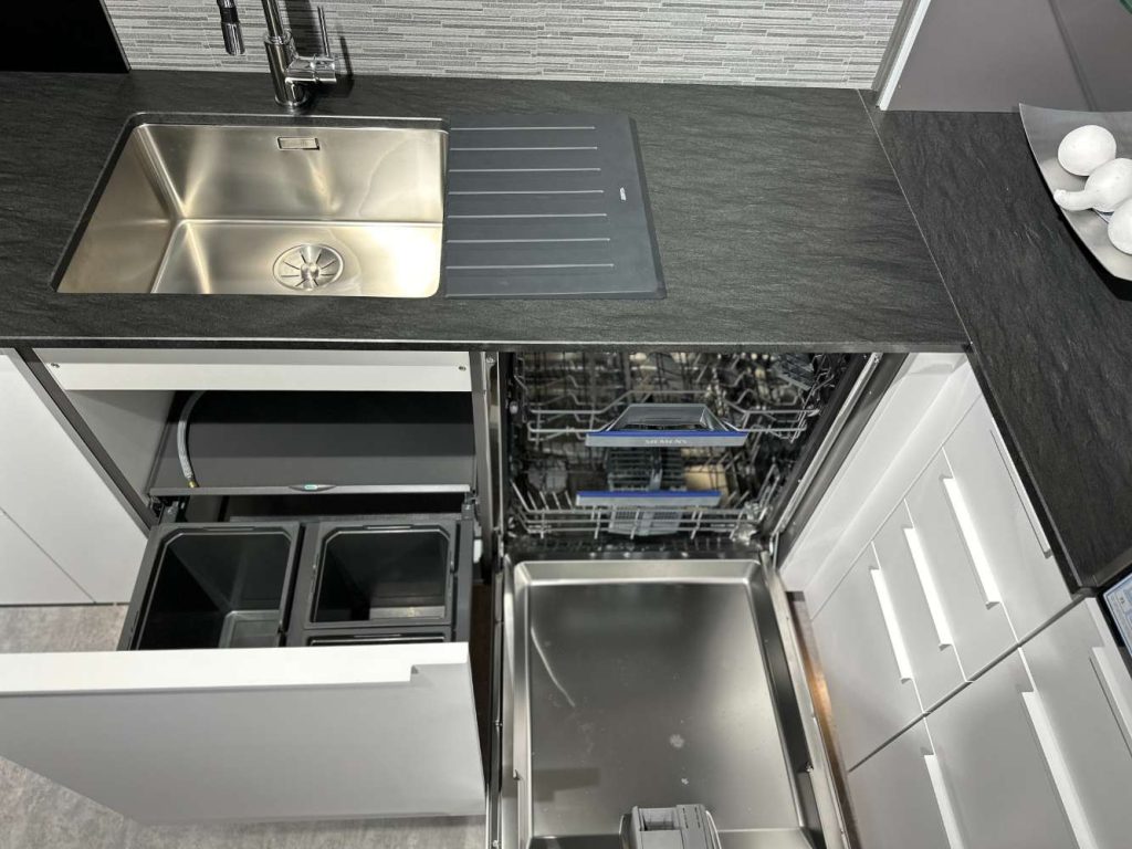 Die klare Linienführung und das Zusammenspiel aus hellen Fronten und dunklen Flächen schaffen eine moderne, ruhige Atmosphäre – stilvoll und zugleich funktional. Die robuste Arbeitsplatte überzeugt nicht nur optisch, sondern auch durch Langlebigkeit und Pflegeleichtigkeit – ideal für den Alltag.