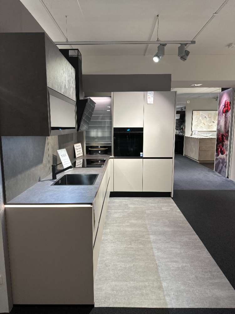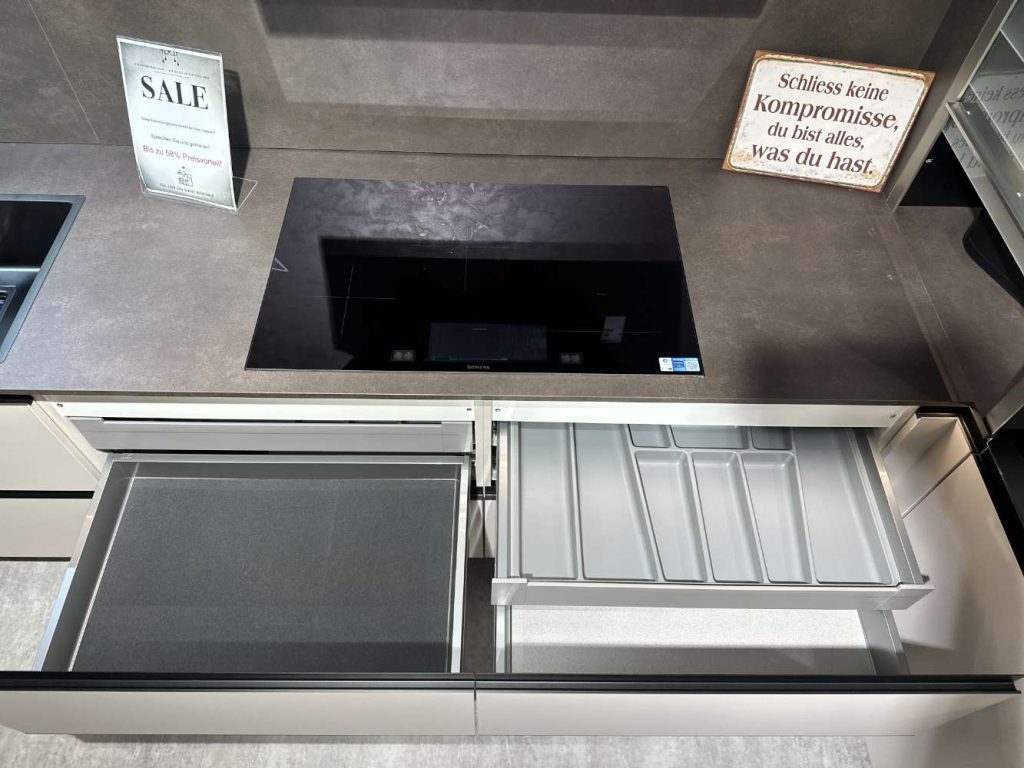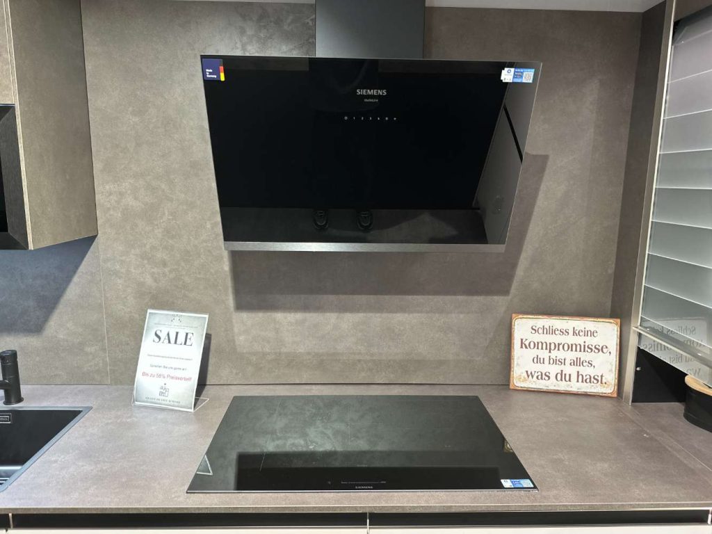 Diese Küche vereint Steinoptik mit matten Oberflächen zu einem modernen, ausdrucksstarken Gesamtbild.