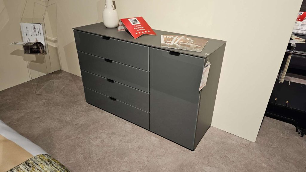 BemerkungDie INTERLIVING 1203 besticht durch ihr modernes und elegantes Design, das perfekt in jedes gehobene Wohnambiente passt. Als Ausstellungsware verfügt dieses Möbelstück über eine hochwertige Front aus Vulkanglas, die ihm eine einzigartige und luxuriöse Ausstrahlung verleiht. Der Korpus und die Platte sind in einem stilvollen Dekor in Vulkanoptik gehalten, das die edle Anmutung des Schranks unterstreicht.