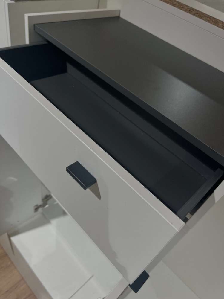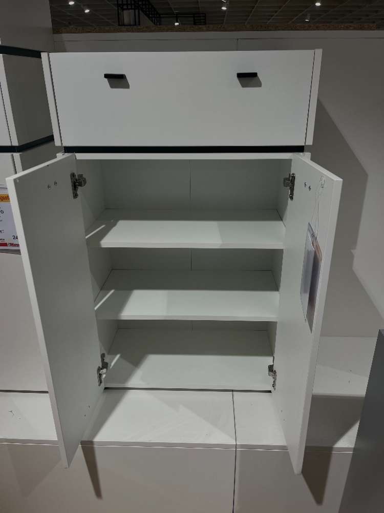 Bemerkung Die Kommode Modesto von GERMANIA besticht durch ihr modernes und minimalistisches Design. Der weiße matte Korpus und die Front strahlen in Kombination mit dem anthrazitfarbenen Absatz eine zeitlose Eleganz aus. Mit einer Breite von circa 60 cm, einer Höhe von 94 cm und einer Tiefe von 34 cm bietet diese Kommode kompakte Maße, die sich perfekt in unterschiedlichste Wohnumgebungen einfügen lassen. Für Ordnung und Stauraum sorgen ein Schubkasten und zwei Türen, hinter denen sich zwei Einlegeböden verbergen. Diese Aufteilung ermöglicht es Ihnen, sowohl kleinere als auch größere Gegenstände strukturiert zu verstauen. Modesto ist ideal, um Ihre Wohn- oder Arbeitsumgebung zu bereichern und dabei gleichzeitig eine aufgeräumte Atmosphäre zu schaffen. Da es sich um Ausstellungsware handelt, profitieren Sie von einem attraktiven Preis-Leistungs-Verhältnis, ohne Kompromisse bei der Ästhetik oder Funktionalität eingehen zu müssen. Erleben Sie mit Modesto eine perfekte Mischung aus Form und Funktion, die den Alltag stilvoll erleichtert.
