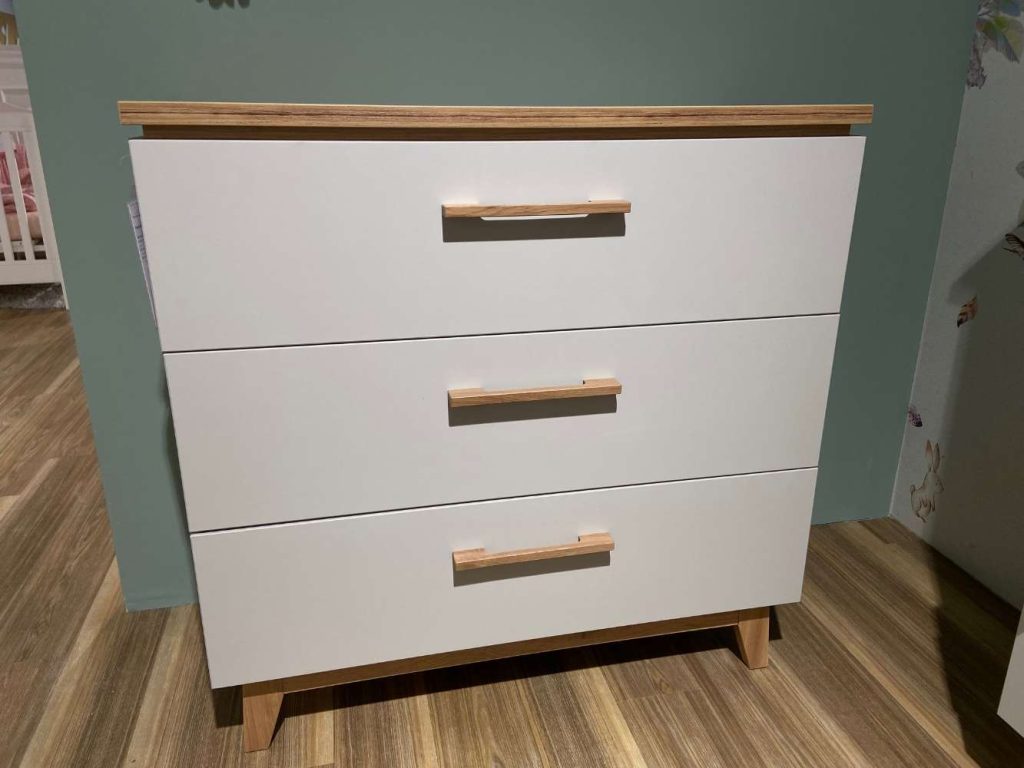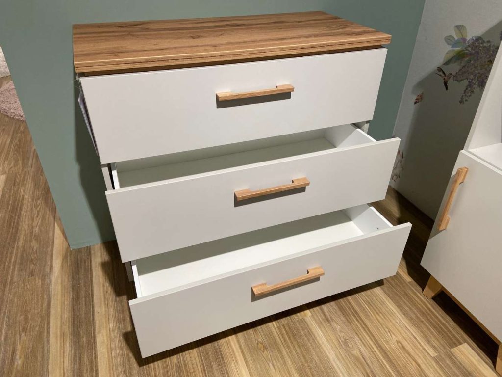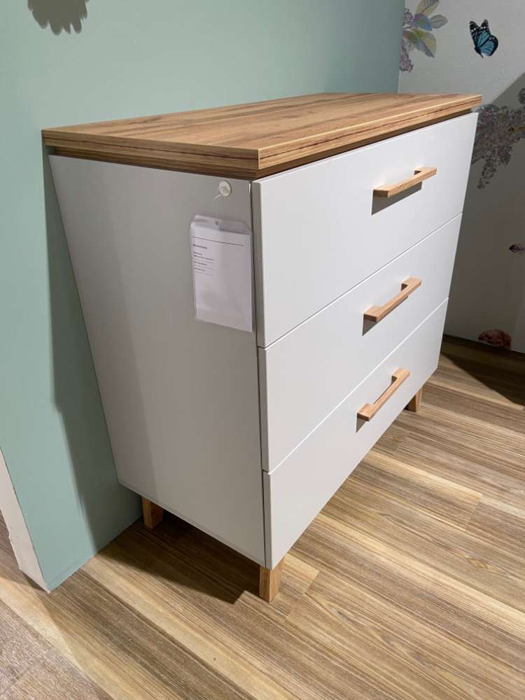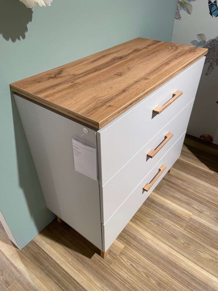Bemerkung Kommode Ausführung: Kunststoff lichtgrau Absetzung: Kunststoff Goldeiche Nachbildung Griffe und Füße: Massivholz mit 3 Schubkästen inkl. Soft-Close BHT ca. 90 x 94 x 43 cm Prüfsiegel: Der Blaue Engel