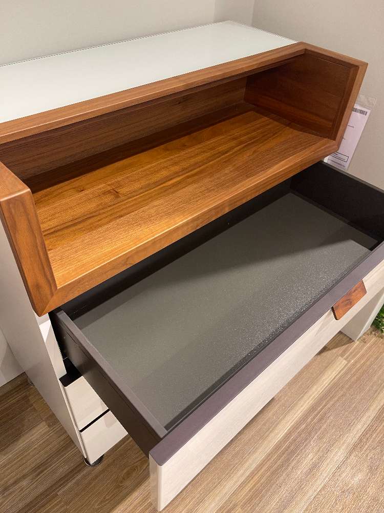 - Lack reinweiß / brüniert Kernnussbaum - B/H/T: ca. 80x78x40 cm - 1 offenes Fach + 3 Schubkästen