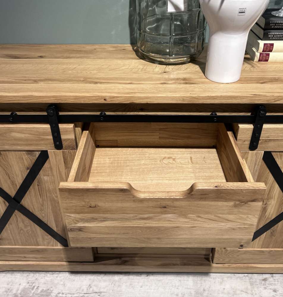 Wildeiche massiv geölt Front durchgehende Lamellen Abs. Metall schwarz