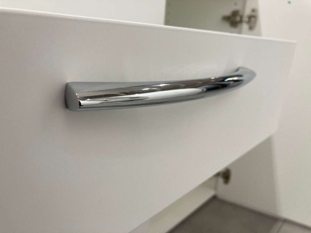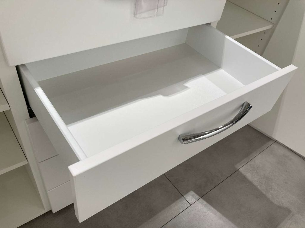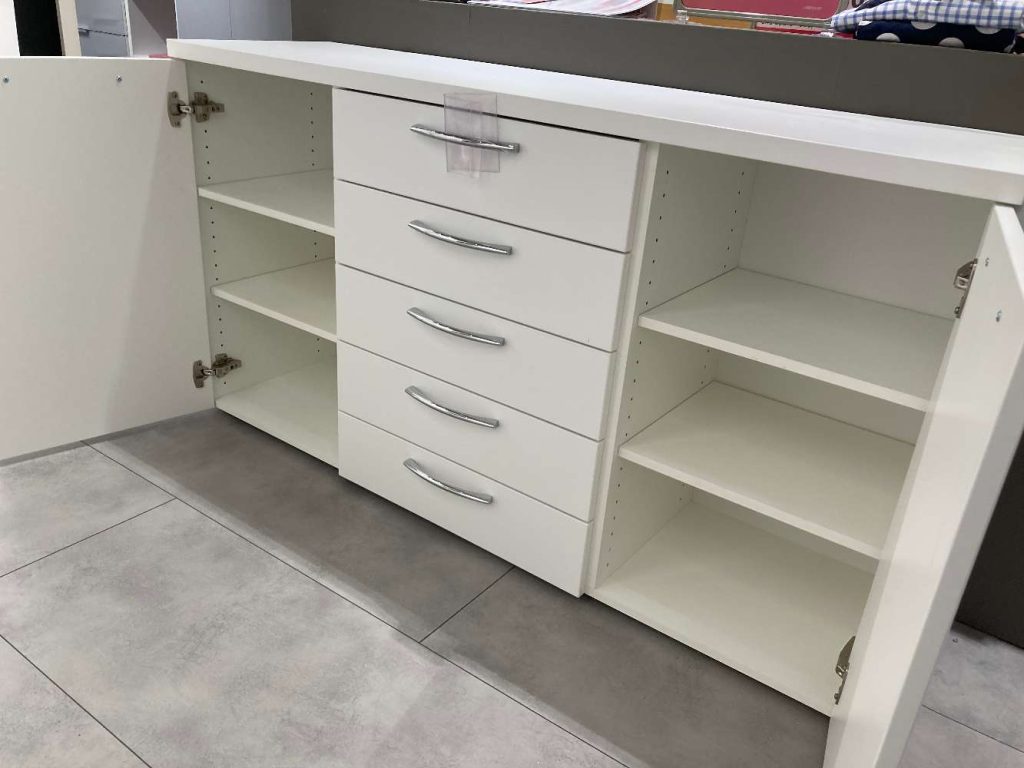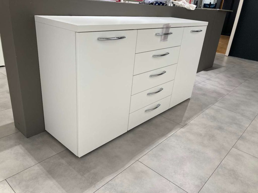 AusführungKommode in Lack weiß, 2 Türen mit Dämpfer, 5 Schubfächer, 4 Einlegeböden, Griffe: gebogen, in Chrom glänzend, Abdeckplatte: Lack weiß, 2,6 cm stark.