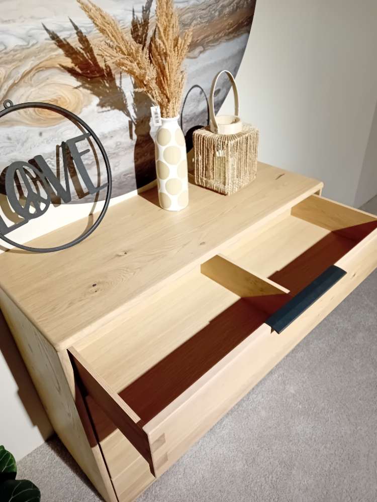 Bemerkung Die Kommode "Kufstein" präsentiert sich als zeitlos elegantes Möbelstück, das durch seine warmen Holztöne eine gemütliche Atmosphäre in jeden Raum zaubert. Mit Fronten aus massiv geölter Asteiche und einem Korpus aus geölter Eiche strahlt dieses Stück natürliche Schönheit und Qualität aus. Die warmen Töne der Eiche harmonieren perfekt miteinander und verleihen dem Möbelstück einen authentischen und rustikalen Charme. Mit seinen kompakten Maßen von 103 cm Breite, 86 cm Höhe und 43 cm Tiefe passt die Kommode perfekt in verschiedenste Wohnräume, ohne viel Platz einzunehmen. Er bietet mit seinen vier geräumigen Schubladen reichlich Stauraum für persönliche Gegenstände, während sein klassisches Design vielseitig kombinierbar ist. Als Ausstellungsware wird das Modell "Kufstein" von einem ungenannten Hersteller angeboten und verbindet funktionale Praktikabilität mit handwerklicher Ästhetik.