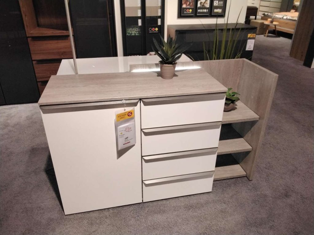 AusführungKommode ca. 100x97x42 cm, Korpus: Platin-Eiche-Nachbildung, Front: Hochglanz weiß, Griff in Edelstahl gebürstet, 1-türig links, mit 4 Schüben und 1 Fachboden mit Anstellregal, ca. 85x85x38 cm und LED-Beleuchtung