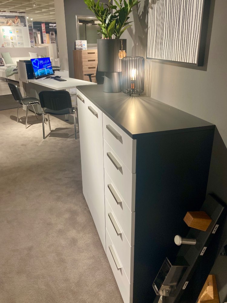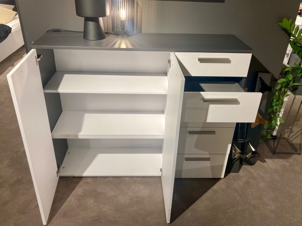 Bemerkung Kommode ca. 140 x 112 x 40 cm Front in Polarweiß, Korpus in Vulkan inkl. Schübe und Türen Sie finden dieses Produkt im 2. OG in unserer Schlafzimmerabteilung, Tel.: 0821-6006-1141