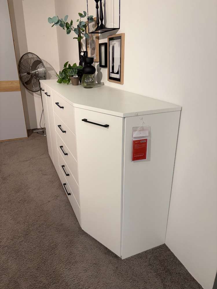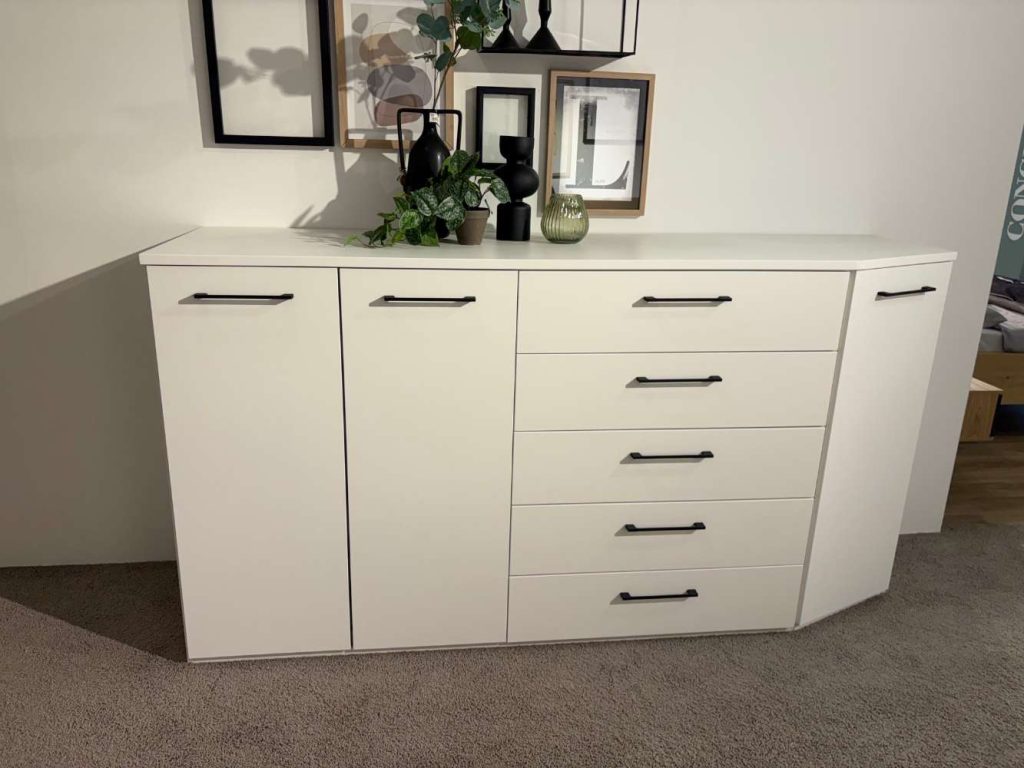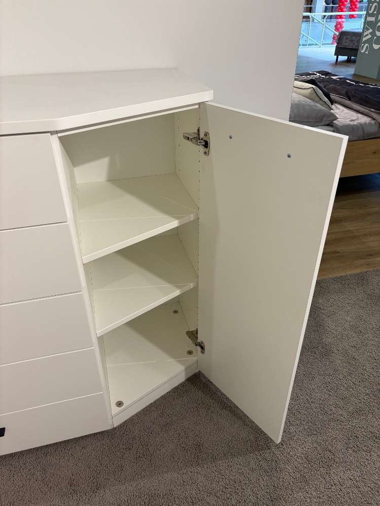 Bemerkung Die Kommode IL 1207 von DISSELKAMP ist ein eindrucksvolles Möbelstück, das in jeder Umgebung als hochwertiger Blickfang fungiert. Diese Ausstellungsware bietet nicht nur reichlich Stauraum, sondern überzeugt auch durch ihr elegantes Design. Mit den großzügigen Maßen von ca. 221,3 cm in der Breite, 116 cm in der Höhe und 60 cm in der Tiefe integriert sie sich harmonisch in unterschiedlichste Raumkonzepte. Die Kommode ist durchdacht gestaltet und besteht aus mehreren praktischen Elementen. So enthält sie ein Grundelement mit vier Einlegeböden, das viel Platz für größere Gegenstände bietet. Ergänzt wird das Set durch ein Anbauelement mit fünf Schubkästen, die dank Softclose-Technologie besonders sanft und leise schließen. Ein schräges Anbauelement mit zwei weiteren Einlegeböden rundet das Angebot ab und sorgt für zusätzliche Flexibilität bei der Organisation von Habseligkeiten. Ganz gleich, ob im Wohn- oder Schlafzimmer platziert: Diese Kommode vereint Funktionalität mit stilvoller Eleganz und passt sich den Bedürfnissen des Alltags perfekt an. Ein absolutes Muss für Liebhaber hochwertiger Möbel, die Wert auf Qualität und Design legen.