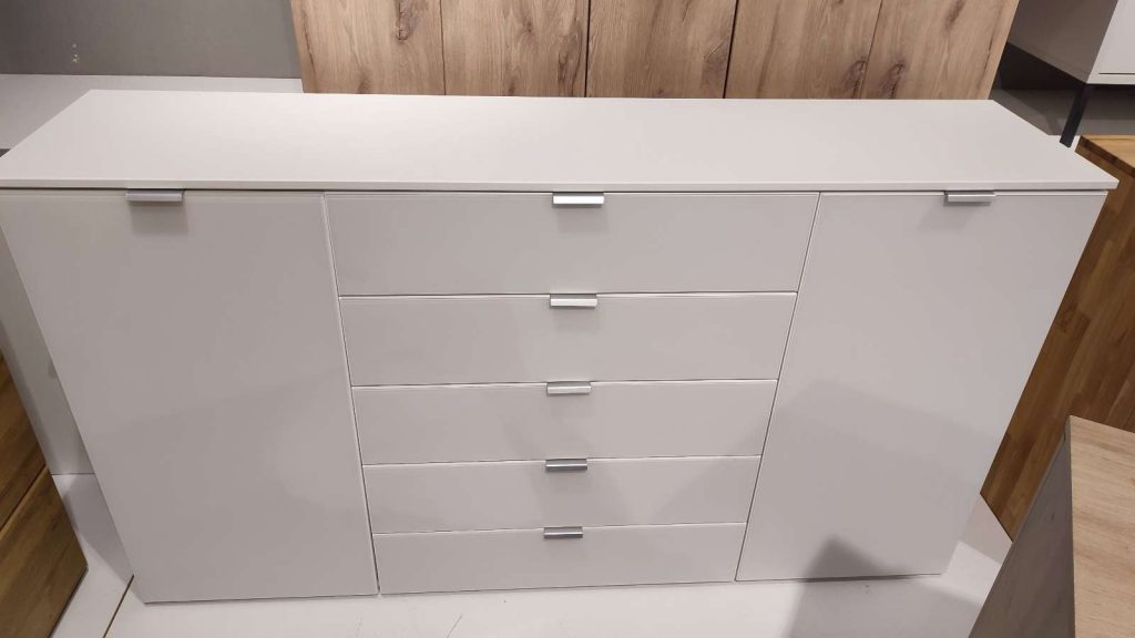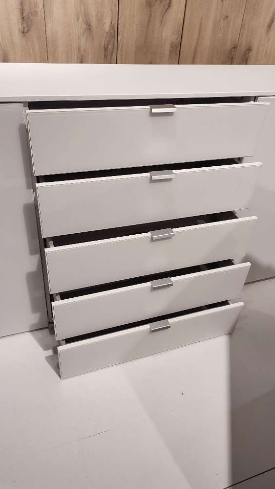 BemerkungDie One 700 Kommode von EXPRESS-MÖBEL verkörpert ein stilvolles und modernes Design, das Funktionalität und Ästhetik auf harmonische Weise vereint. Diese elegante Kommode ist ein wahres Schmuckstück für jeden Raum und fügt sich dank ihrer klaren Linien und der zeitlosen Farbkombination nahtlos in verschiedene Einrichtungsstile ein. Die Front aus weißem Glas verleiht der Kommode eine elegante, glänzende Oberfläche, während der Korpus in dezentem Polarweiß eine ruhige, harmonische Atmosphäre schafft. Ausgestattet mit zwei Türen und fünf Schubladen bietet die One 700 großzügigen Stauraum, um Ihre Habseligkeiten ordentlich zu verwahren. Die grifflosen Fronten mit fein mattierten Aluminiumakzenten unterstreichen das minimalistische Design und sorgen für eine moderne Optik.