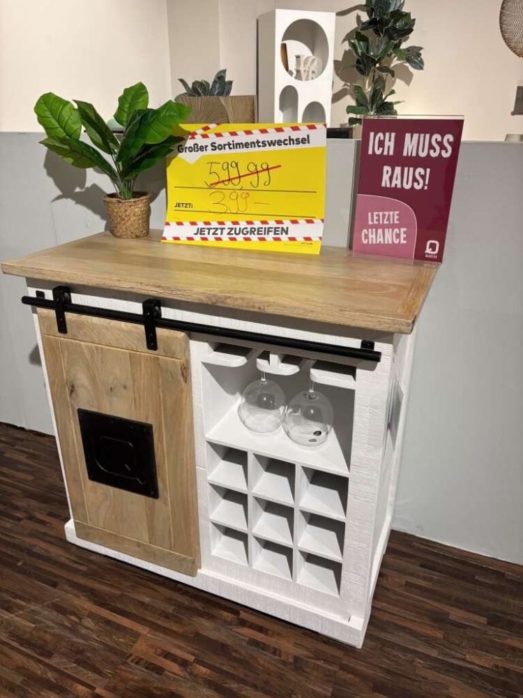 Bemerkung Korp. Mango massiv sägerau, weiß lack Front/ Platte mango massiv geb. lack. Inneneinteilung MDF weiß lackiert Metallaplikationen schwarz lackiert 1 Schiebetür links: 1 Ablagefach 2 Schubladen rechts: 9 Flaschenhalter 2 Glashalter