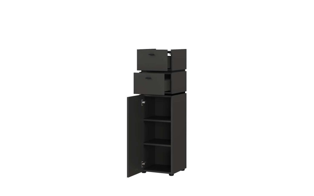 BemerkungKommode mit Korpus und Front Melaminharzbeschichtet in graphit, Oberboden in Balkonoptik Absetzung in schwarz.1 große Schublade und 2 Türen die durch integrierter Dämpfung langsam, sanft und geräuschlos schließen, Steggriffe aus Metall, B/H/T ca. 34 x 117 x 34 cm.