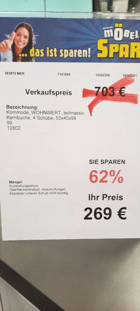 Bemerkung Hierbei handelt es sich um ein Angebot von Möbel Spar Standort des Artikels ist Merseburg Details wie technische Daten (Maße etc.) oder Schäden entnehmen Sie dem Bild mit Preis. RESERVIERUNG: Bei einem längeren Anfahrtsweg und vorheriger Absprache mit der Verkäuferin vor Ort ist eine Reservierung, für die Dauer der Fahrt maximal jedoch für 4 Stunden möglich. Von Sonderanfragen bitten wir abzusehen. Versand: Grundsätzlich bieten wir keinen Versand unserer Artikel an. Aufgrund von meist vorhandenen kleineren bis größeren Mängeln, ist ein Fernabsatzgeschäft nicht möglich. Da der Kunde die Mängel selbst vor Ort und Kauf sehen und dafür unterschreiben muss. Bei Kleinartikeln im Deko Bereich oder Restpostenbereich besteht ggf. die Möglichkeit fragen Sie uns hierzu einfach an. Transport: Wir selbst bieten keine direkten Zufuhren / Lieferungen an, haben aber in jeder Filiale Minimum einen externen Anbieter der dies für uns übernimmt. Die Kontaktdaten geben wir bei Interesse gerne weiter. Aus Haftungsgründen ist dies ein Fremdgeschäft und wird zwischen dem Kunden und dem Transportunternehmen getroffen und ist unabhängig von der Möbel Spar GmbH. Umlagerung: Sie haben einen Artikel entdeckt welcher in einer anderen Filiale als Ihre nächstgelegene lagert? Kein Problem, wir bieten eine interne Umlagerung an. In diesem Fall muss der Kunde eine Anzahlung in dem Abholmarkt tätigen. Je nach Größe und Aufwand kann eine individuelle Transfergebühr berechnet werden. Der Kauf ist keine Pflicht, es wird aber bei Nichtgefallen und Wegfall des Verkaufes eine pauschale Bearbeitungsgebühr in Höhe von 15€ einbehalten, ebenso die ggf. angefallene Transfergebühr. WICHTIG: Bitte telefonisch erfragen ob der Wunschartikel noch verfügbar ist. Zwischenverkauf vorbehalten. Die Besichtigung, der Verkauf und die Abholung erfolgt ausschließlich bei unserem Handelspartner: MÖBEL SPAR GmbH 06217 Merseburg , Klobikauer Str.14( Einfahrt über Geusaer Str.15) Ihre Ansprechpartner Frau Reimann , Frau Jenske oder Frau Lärche erreichen Sie telefonisch unter 0176-578 90 762 bzw. 03461-2756990 Öffnungszeiten : MO-FR 10:00-19:00 Uhr, SA 10:00 – 16:00 Uhr Alle Inserate sind unverbindlich. Preisirrtümer und Änderungen vorbehalten. Abbildung ähnlich. Mehrere Rabattaktionen sind nicht kombinierbar. Weitere sichtbare Artikel können bei Verfügbarkeit zusätzlich erworben werden Vielen Dank das Sie auf unserer Seite gelandet sind, besuchen Sie unseren Shop um weitere spannende Artikel zu finden.