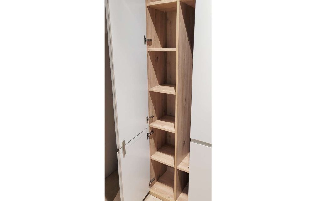 Bemerkung Korpuselement mit Korpus aus Asteiche und Front in seidengrau lackiert, 2 Türen mit Griffleiste aus Vinylharz, Softclose Funktion, 6 Einlegeböden, 1 ausziehbare Kleiderstange, B/H/T ca. 90 x 219 x 39,6 cm.