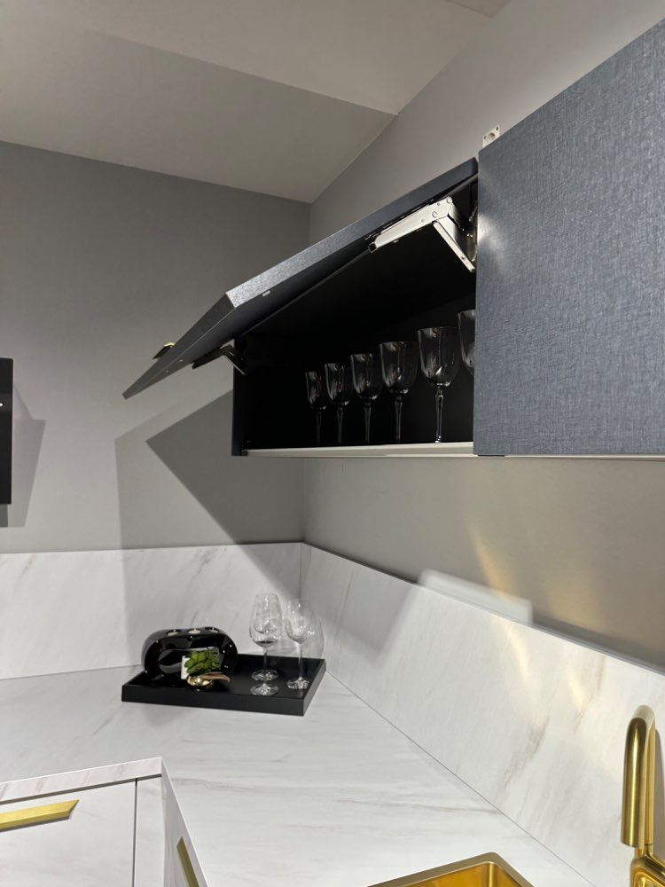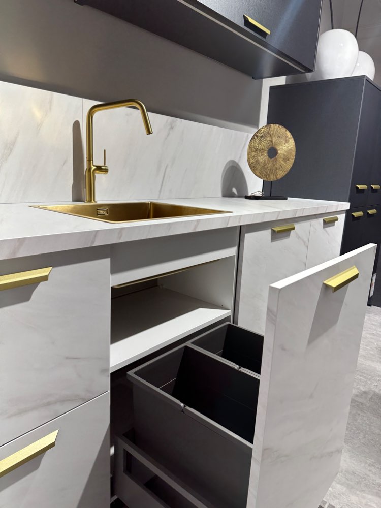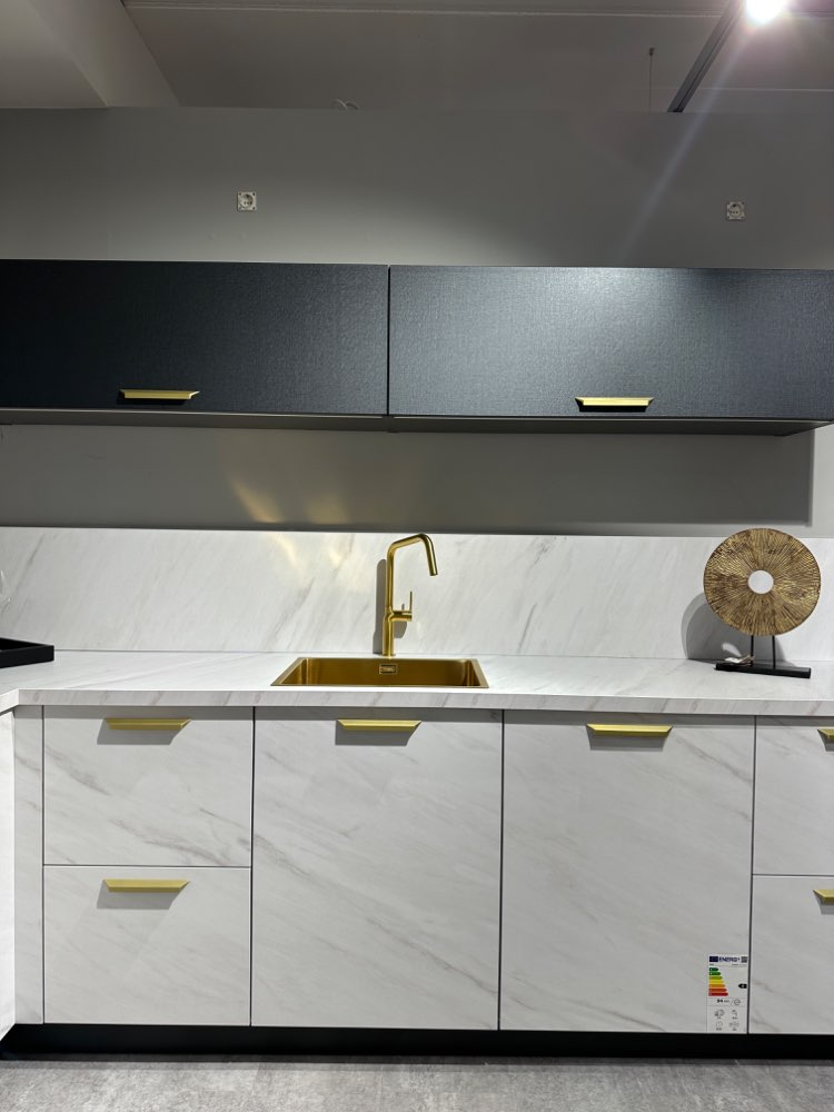 Dank der großzügigen Maße von 2200mm/2000mm/4000mm bietet diese Austellungsware ausreichend Stauraum für all deine Küchenutensilien. Die Front in Marmor Avorio kombiniert mit dem weißen Korpus und Anthrazit Details ergibt ein harmonisches Gesamtbild, das jedem Raum das gewisse Etwas verleiht.