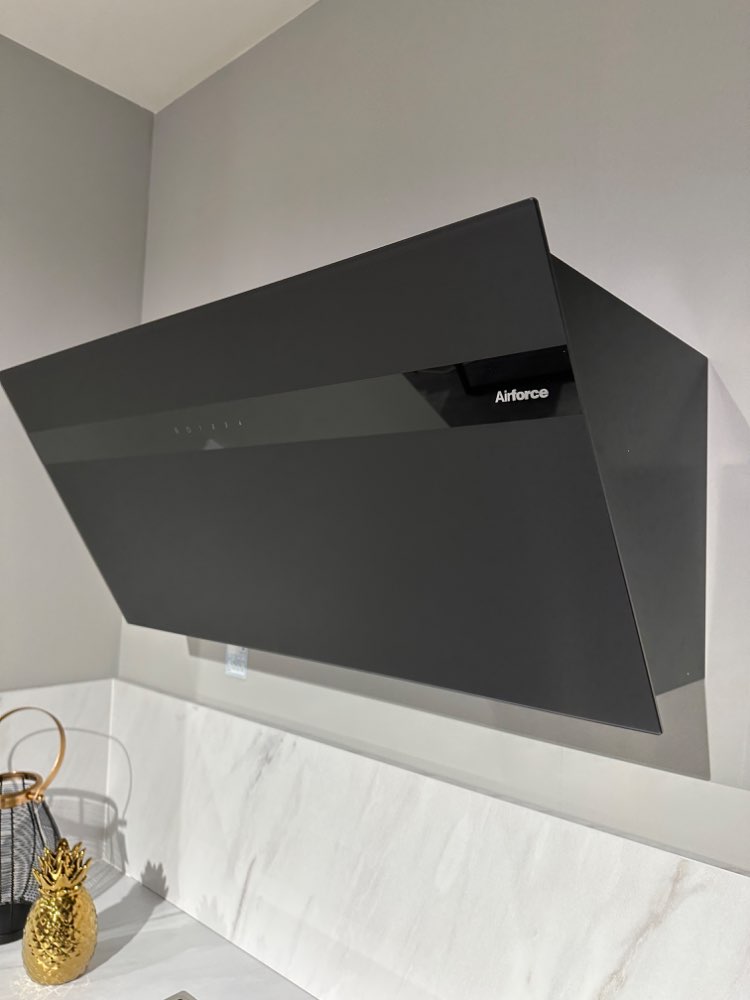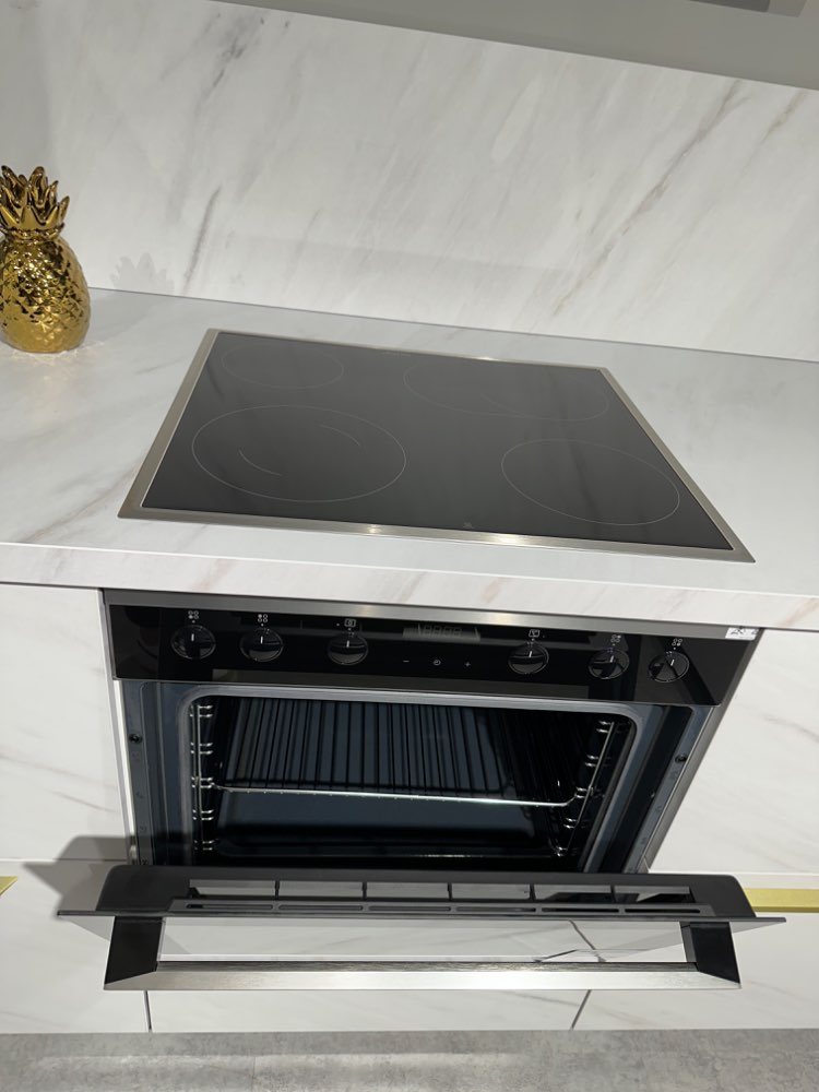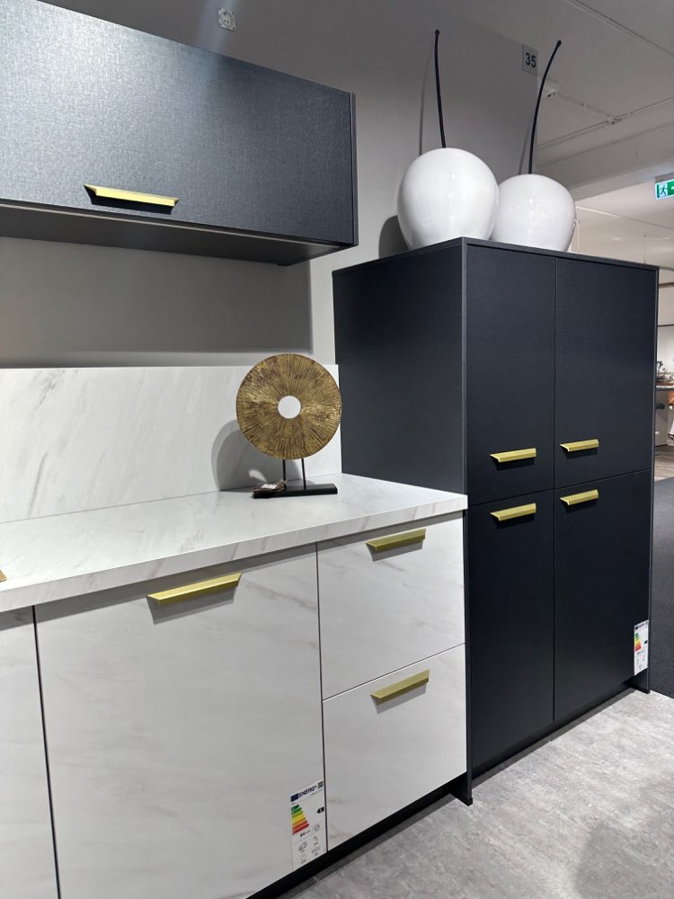 Die Arbeitsflächenhöhe von 94cm sorgt für eine ergonomische Arbeitsposition und die eckigen Griffe in Gold runden das moderne Design perfekt ab. Die E-Geräte in schwarz und Edelstahl passen optimal dazu und bieten höchste Funktionalität.