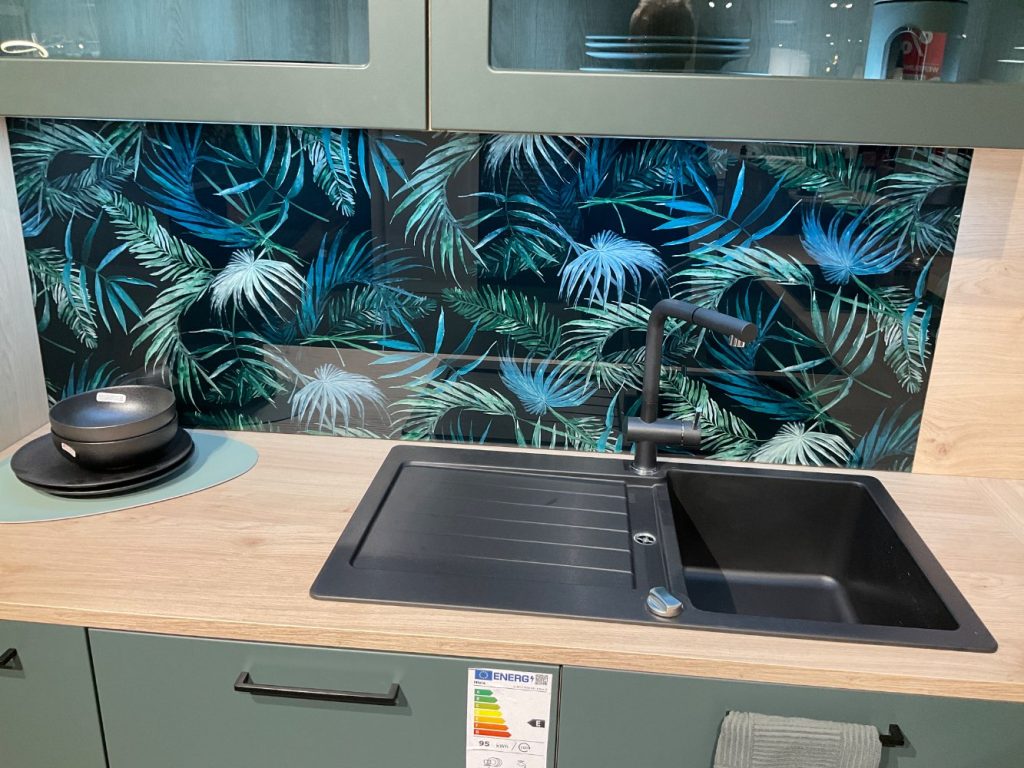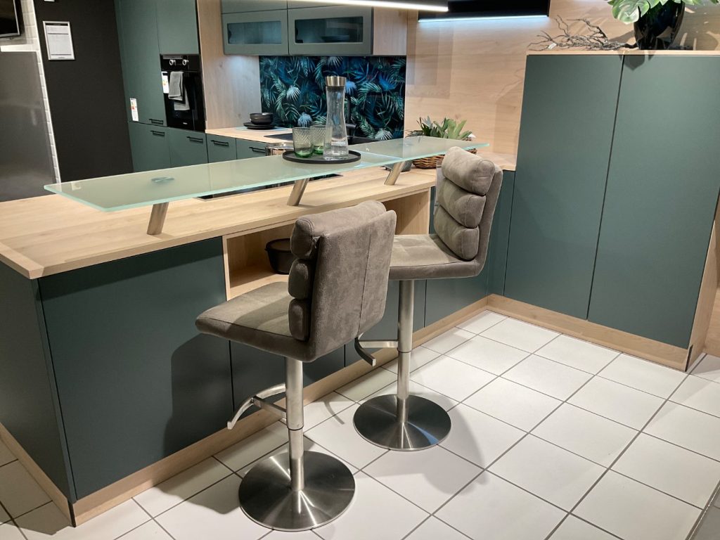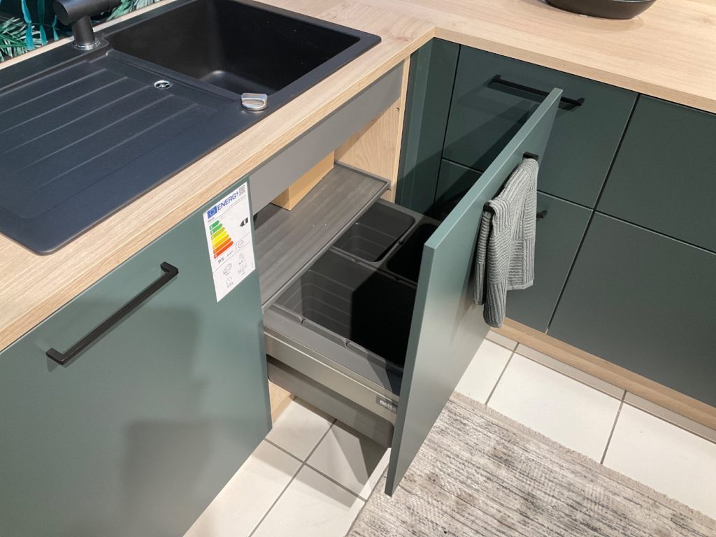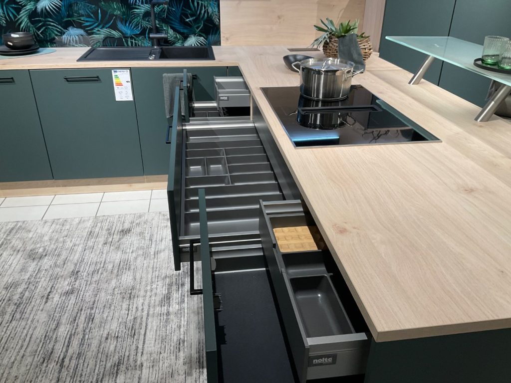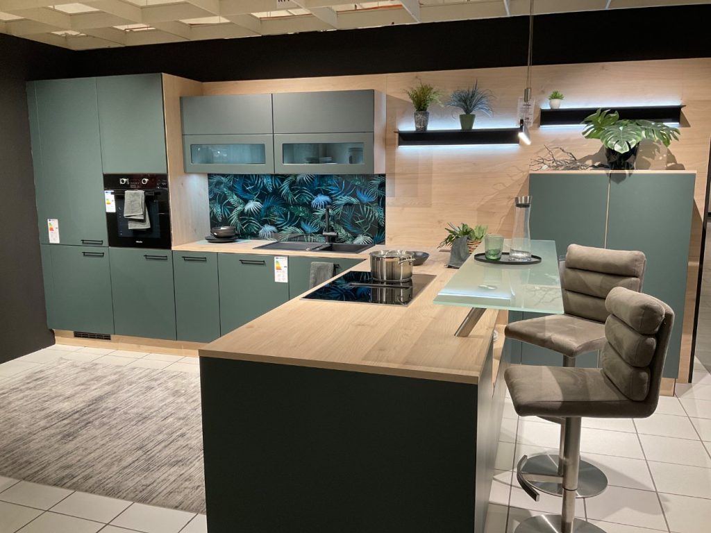 BemerkungDie Soft Lack Ausstellungsküche von NOLTE KÜCHE präsentiert sich in einem modernen Stil und verleiht jedem Raum eine stilvolle und elegante Atmosphäre. Die Kombination aus der "Black Green" Front und dem natürlichen Asteiche Korpus Nachbildung sorgt für einen faszinierenden Kontrast, der sowohl modern als auch zeitlos wirkt. Die softmatte Oberfläche unterstreicht das hochwertige Design dieser L-förmigen Küche, die sich mit ihren großzügigen Maßen von ca. 515 x 288 cm nahtlos in verschiedenste Raumkonzepte einfügt.