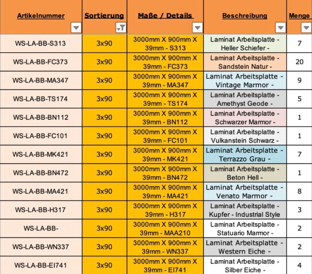 Es ist eine Übersichtstabelle beigefügt als Foto, mit dem Stand 24.01.2024, Mengen unverbindlich, diese können sich täglich ändern. Bitte bei Bedarf vorher anfragen!