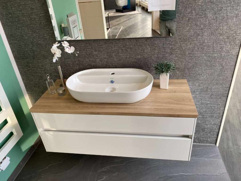 Bemerkung Laguna Badmöbel 122x50cm mit Duravit LUV Aufsatzbecken 68x40cm weiß, Konsole 28 mm Eiche, Front + Korpus: Weiß matt mit Spiegel 100x80cm als Abverkauf aus der Ausstellung . NUR ABHOLUNG. Ohne Armatur