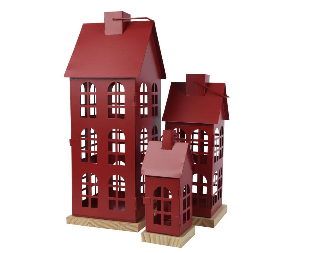 Laterne rot, Metall, B/H/T ca. 8x20x8 cm, ca. 12x30x12 cm und ca. 16x45x16 cm.
