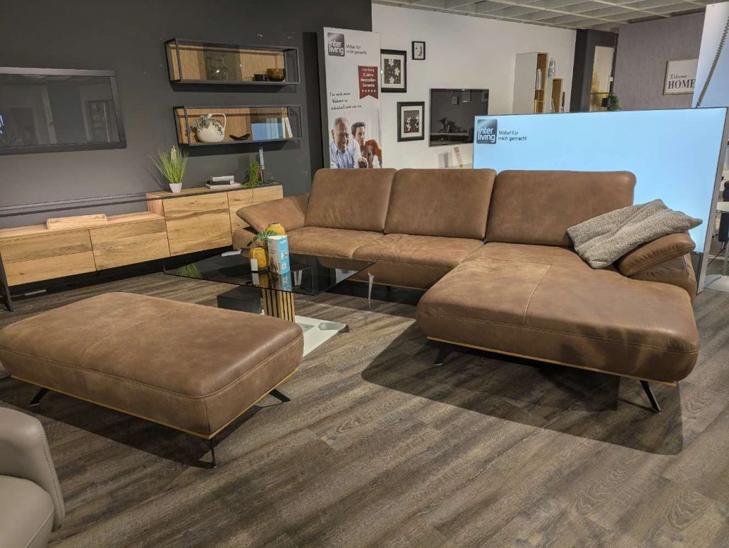 BemerkungLongchair- Garnitur in geschliffenem Leder mit Sichtholzrahmen in Wildeiche und XXL-Hocker