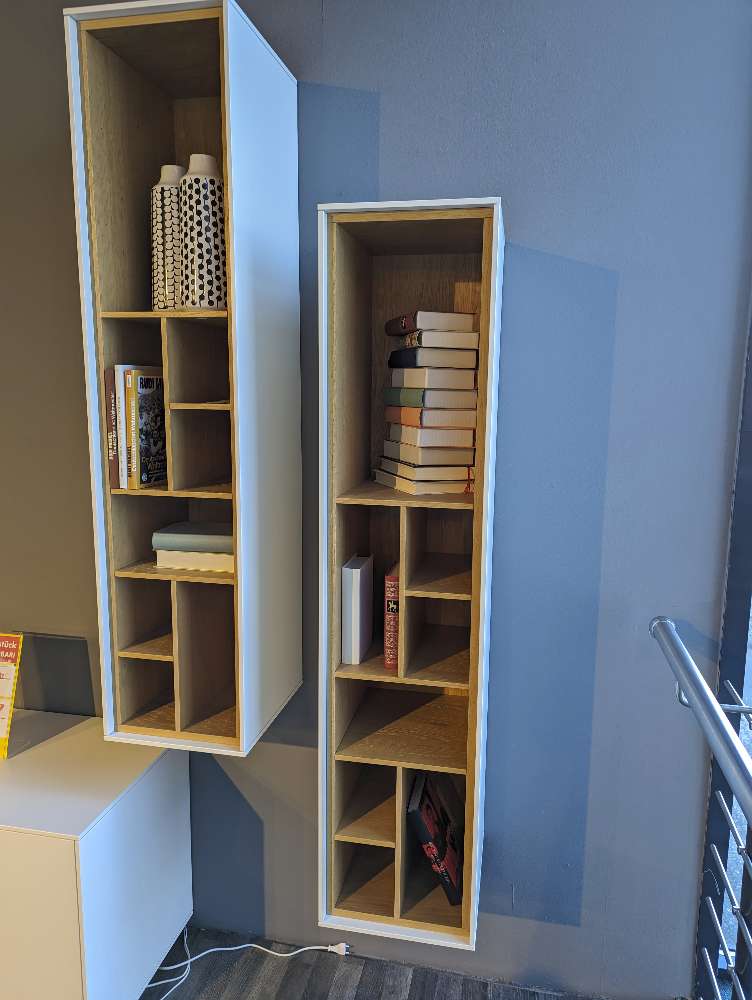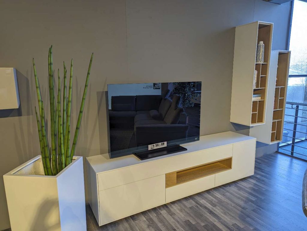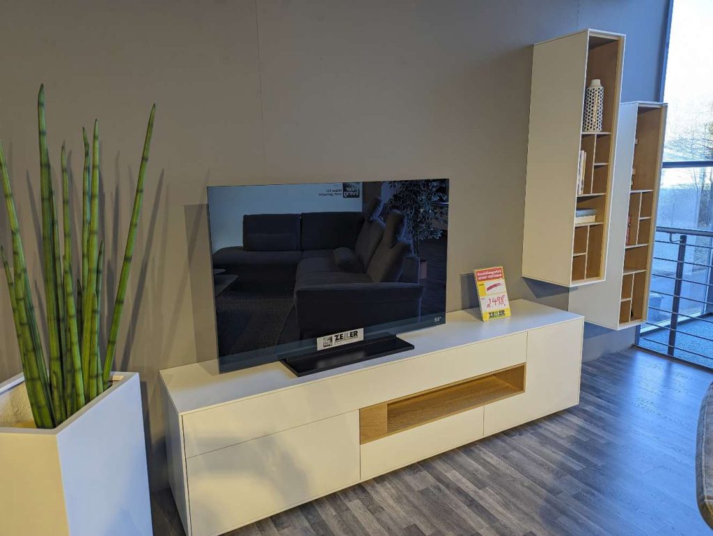 Bemerkung TV Lowboard Lack weiß matt mit zwei Hängeelementen, Akzent Wildeiche