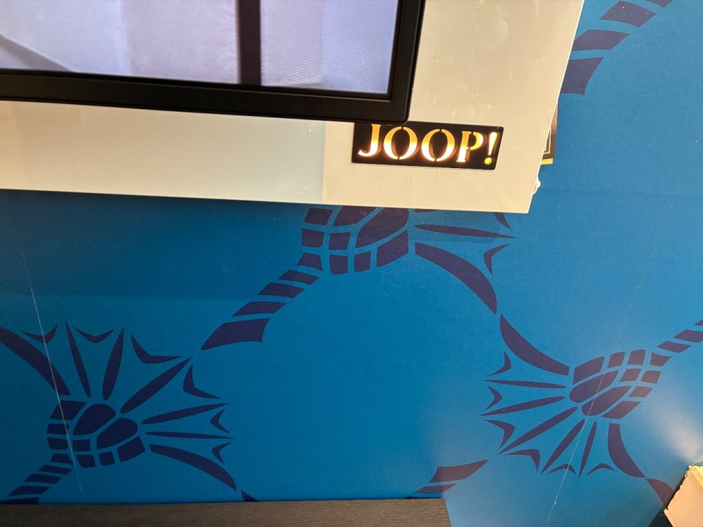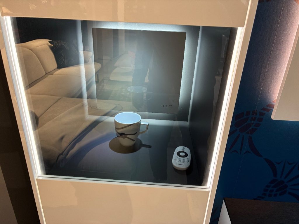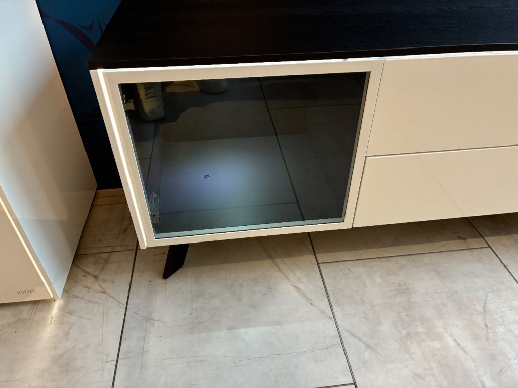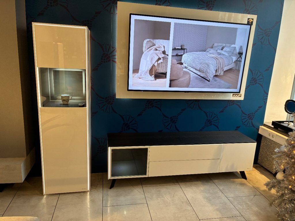 Inkl. 4 Einlegeböden hinter Tür ca. BHT 47,50 176,10 42,40 cm, TV-Paneel Lack Bianco Weiß Hochglanz quer zur Wandbefestigung mit Kabeldurchlas mittig inkl. Beleuchtung 3-seitig und Joop! Logo black unten rechts ca. BHT 173,00 108,00 3,20 cm